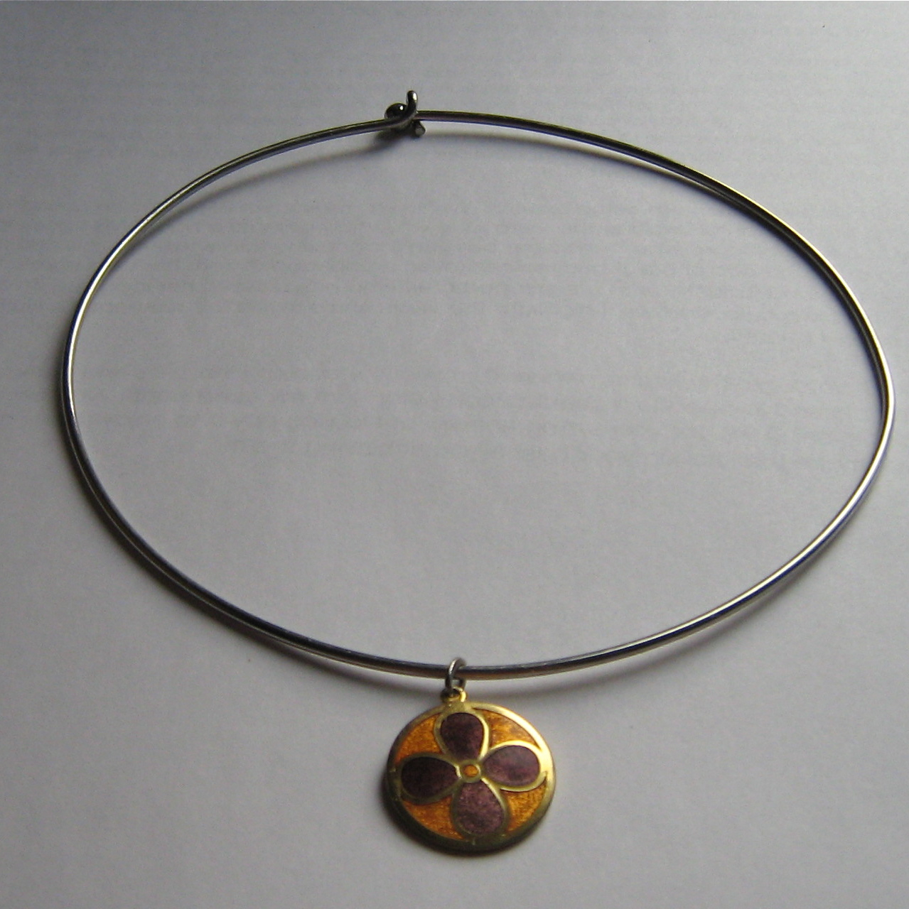 Another pretty piece by the Quebecois enamellists de Passilé-Sylvestre. I don’t really have any scholarly notes to add about this husband-and-wife design team. I do like the pretty yellow and lilac colour combination of this petite pendant. It was all on its lonesome, so I added it to a wire choker as it seemed appropriate. I’ve also added it to the Etsy store. I need to be ruthless in not hoarding things no matter how beautiful they are.