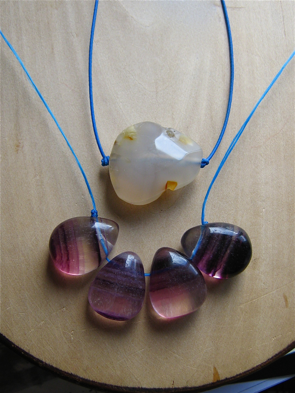I was meeting my friend Elizabeth for dinner on Dundas West last Thursday. Not only was I feeling a little under the weather (I woke up with a pesky cold), but the actual forecast was rather unpleasant. It even began to snow. Since I was early for the reservation, I decided to duck into Soo Ling Beads at Dundas and Ossington to escape the flurries. I found some cool semi precious gemstones — four flourite drops and a facetted carnelian bead — and some electric blue cord to hang them from.