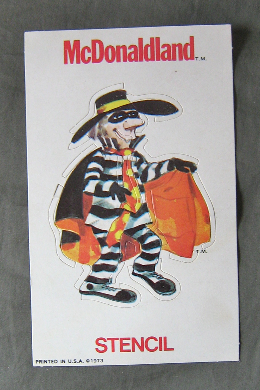 Last week McDonald’s introduced their new Hipster Hamburglar. Last weekend, I rediscovered this 1973 McDonaldland Hamburglar stencil. This is what you got with your Happy Meal (or maybe if you had your birthday at McDonalds) back in the day. It was a present from my friend Rob when he moved to Halifax (around the same time we bought this house).