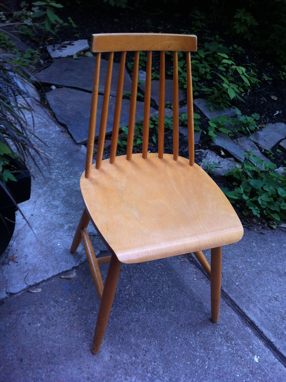 It’s mostly official: We have found a new place to live and now the purging and packing begins in earnest. Since we’re downsizing that should mean no more dragging furniture finds into the house. But I couldn’t resist this stick back chair. It has no labels or marks, but it looks a bit like my Folke Påalsson J77 chairs. My un educated guess is that is a Canadian made Scandinavian-style piece.