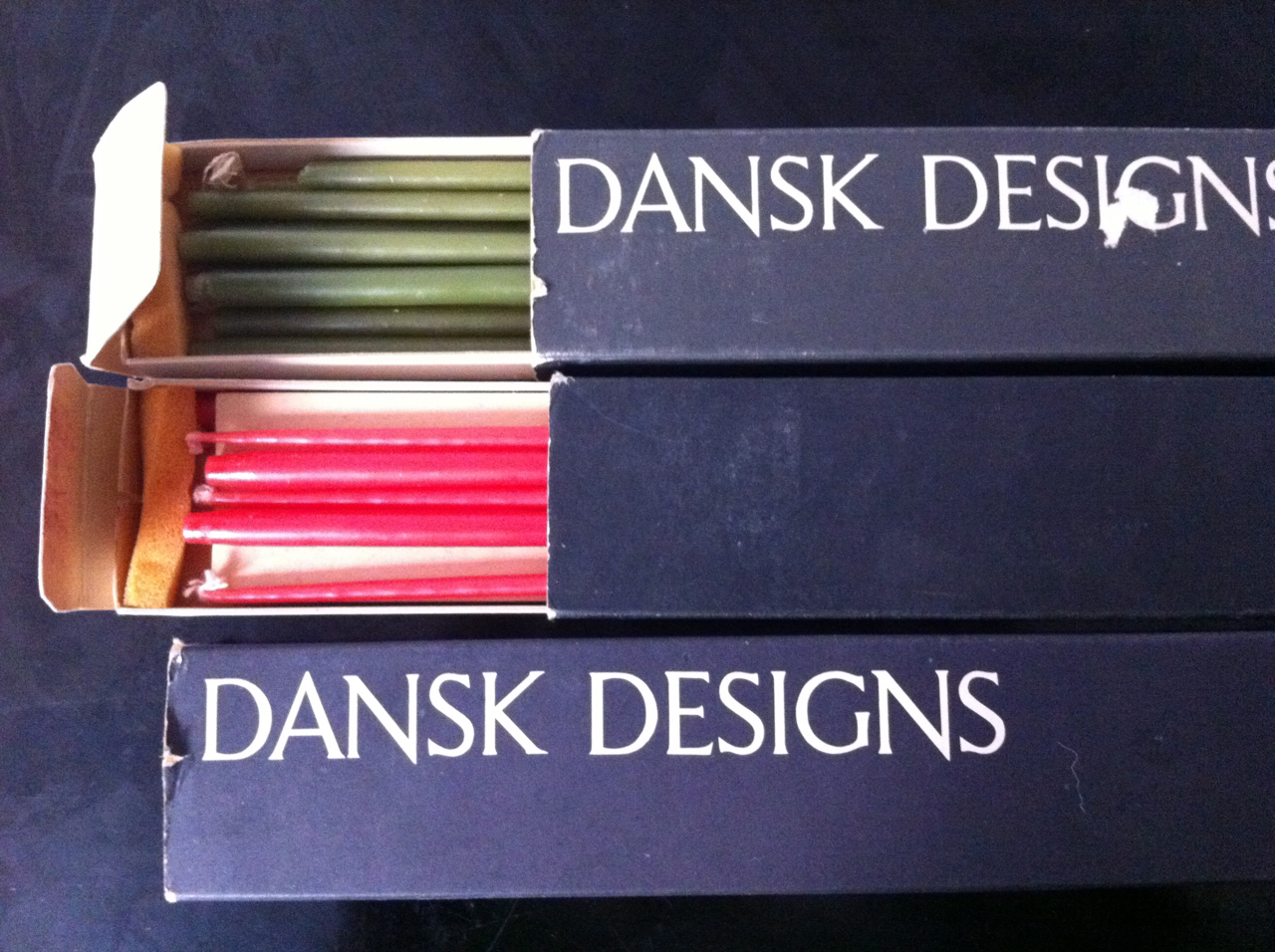 Look what I found in the basement! It’s three sets of Dansk tapered candles that I bought at a thrift shop decade ago, hoping to one day come across a Dansk candle holder like the one my parent’s had in the 1960s. As I recall, my mom also had a stash of these in the basement long after the candle holder got lost or sold. I have a brief recollection that they were all broken (the tapers are so very fragile due to their slenderness) or warped. But the boxes were so cool!