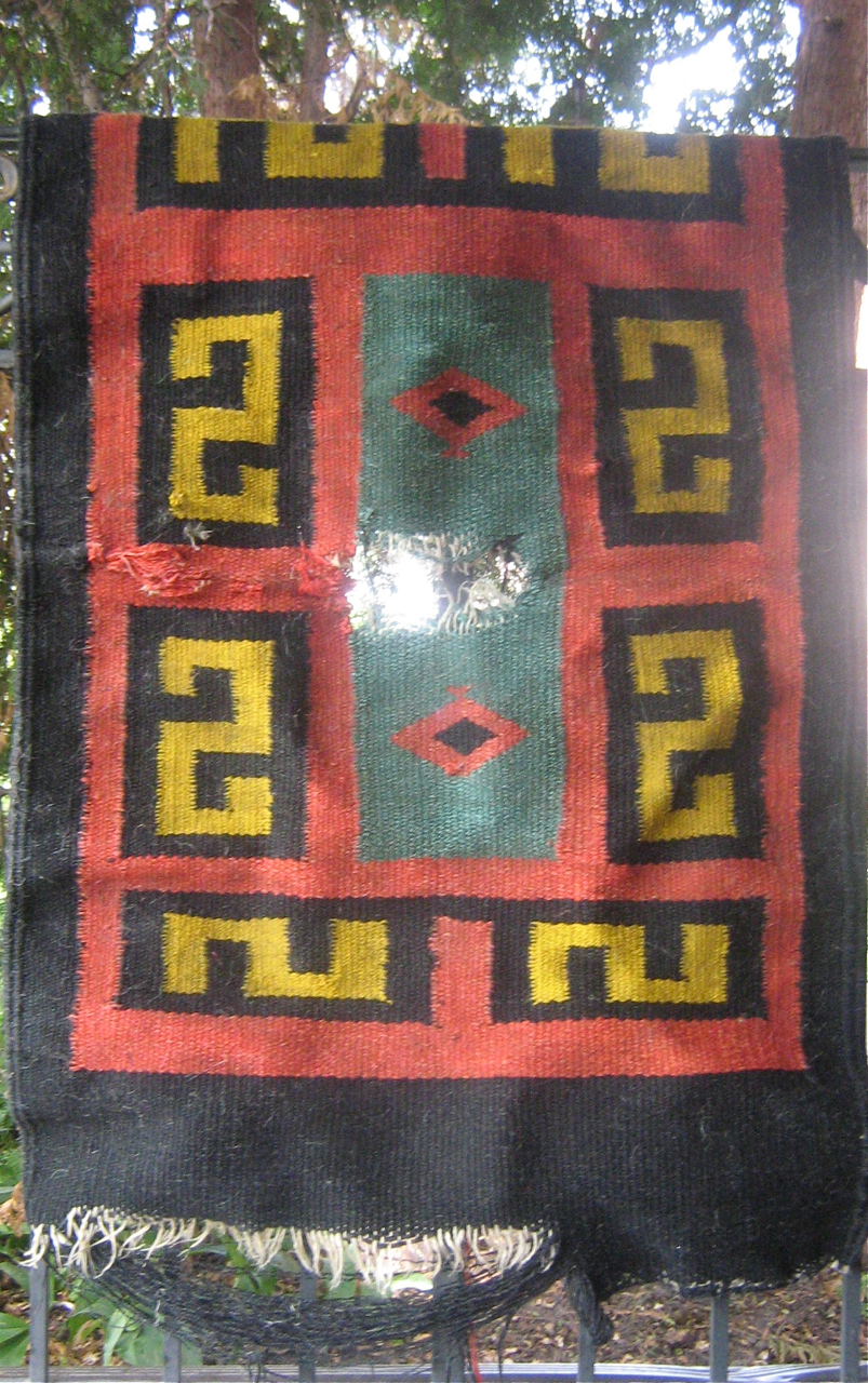 Back when we were staging or house, I took a bunch of rugs in to get cleaned and repaired. There were two pieces that were, unfortunately too expensive to fix. This Southwestern rug is one of them. So I’ve decided that while I can’t afford to have it restored, I can at least patch it up so that it is useful again. I’ve been inspired by two things: An acquaintance who darns his clothes until they become a rich tapestry of patches and Japanese Boro fabrics.