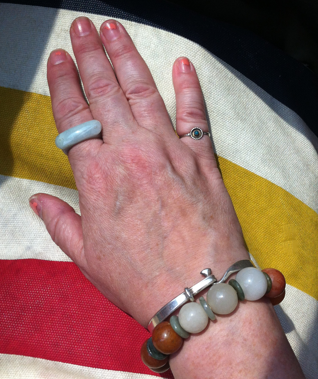 Thing three was an unplanned accomplishment. I took the underground PATH between my doctor and the Bay, I discovered that they are shutting down the shopping concourse between the Sheraton and the Bay, so the little jewellery stands were having closing sales. I had to stop to see if there were any super savings when I spotted this blue jade saddle ring. I broke my lucky jade saddle ring when I was in New York back in June and have been looking for a replacement ever since.