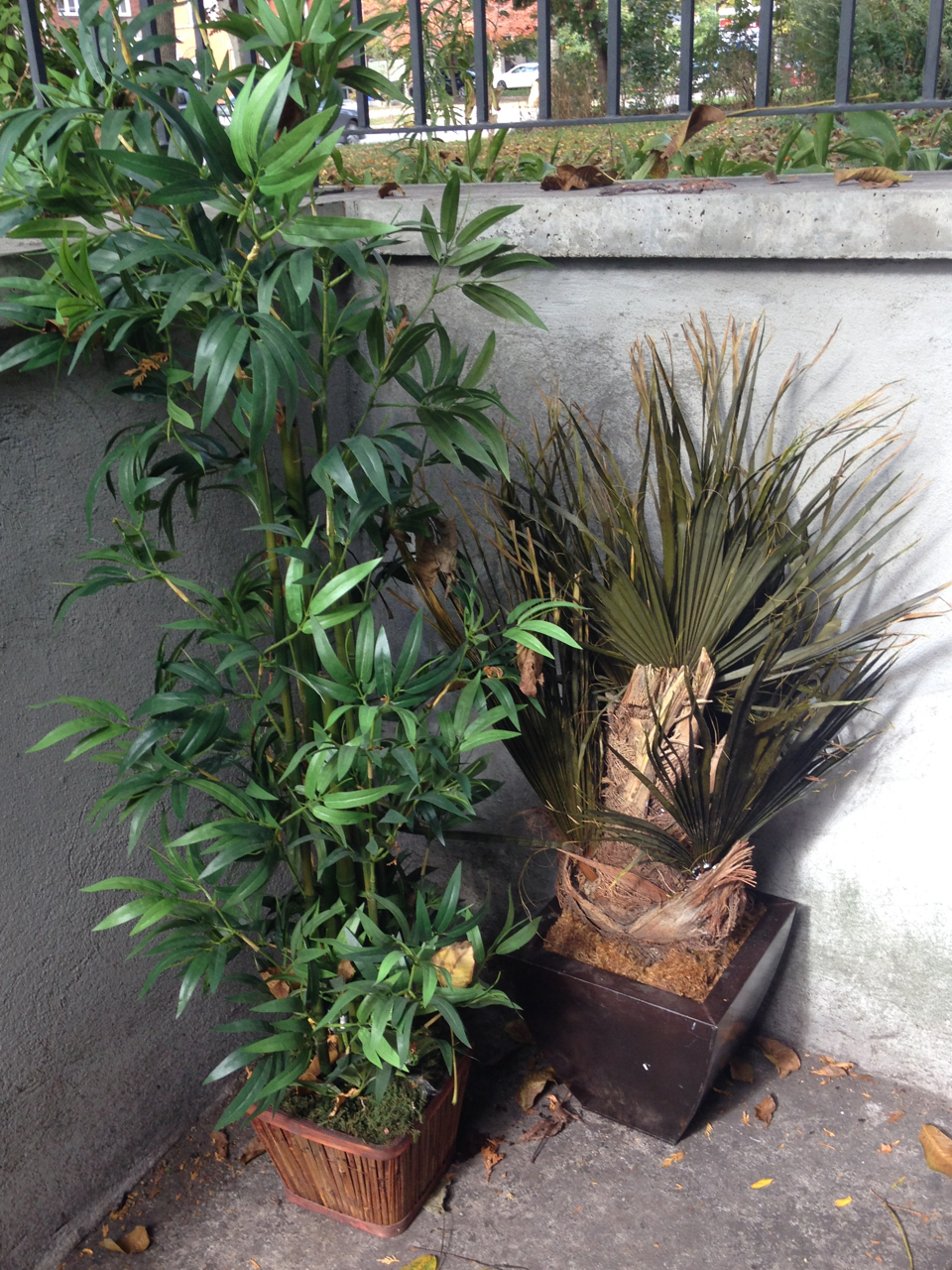 Please welcome the latest addition to our collection of artificial flora — a fake palm plant. It was all beat up, the fronds pulled out from the base and the moss that covered the foam base was torn away. Evidence suggests that someone had tried to pry it from its metal pot and then abandoned it. I’m basing this guess on the fact theat there was a mangled, potless fake ficus lying on the street beside the palm.