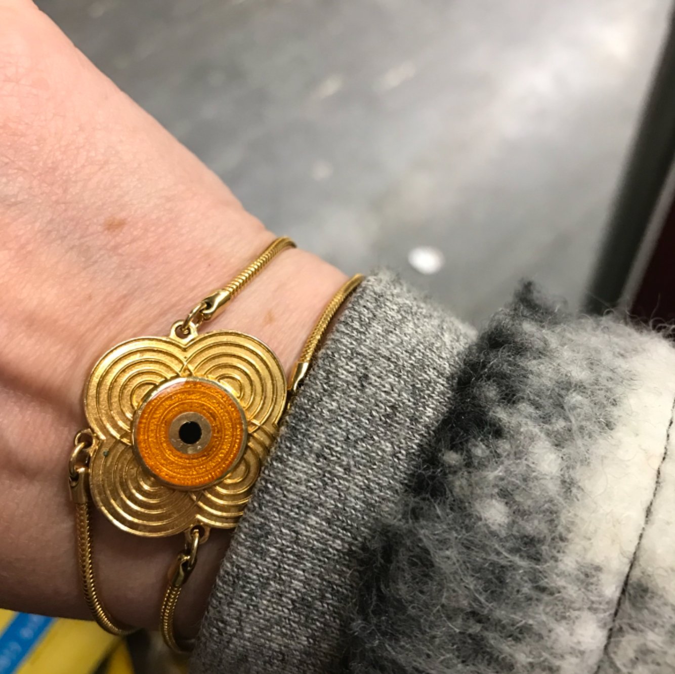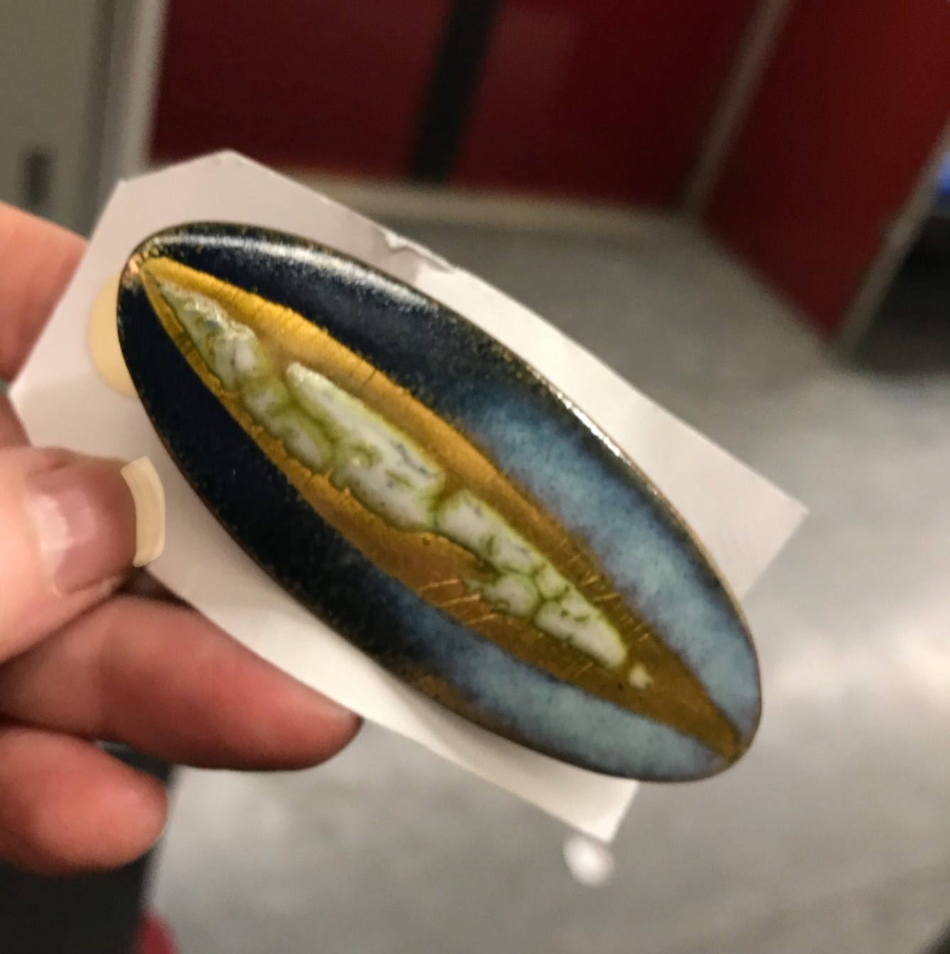 I also picked up another another example of Mid Century jewellery — an enamel on copper brooch signed Beri. Still researching this maker but am happy to add it to the collection for now.