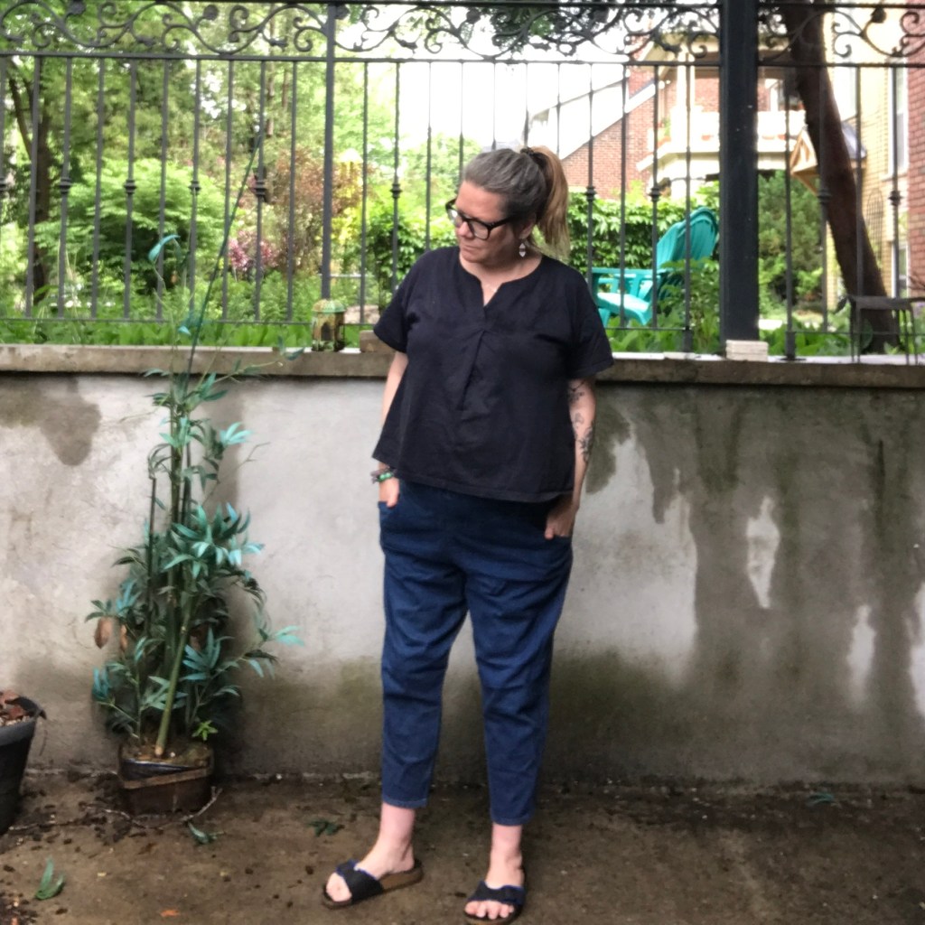 There’s also a sort of dubious dollar store/postal box rental depot around the corner from our house. I went in looking for mailing envelopes (which have been deemed non-essential items at most places). And on top of the rack of over-sized Gildan tshirts and pleather jackets, there was a bin of New old stock Gitano jeans from the 1980s. We’re talking authentic Mom jeans. I bought a pair and fell in love with the cut and the colour. The only problem is that they have an elasticize waist that had lost all its stretch from age. I had some elastic ribbon at home and improvised a new waistband so these trousers would fall down as I walked.
