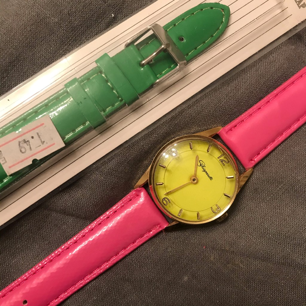 From the same store I found and bought these fantastic plastic watch straps. I had just been telling a friend that I wanted a shocking pink patent band for my vintage Elsa Schiaparelli watch so it was destiny! I also got a lime green version in case I felt like switching things up.