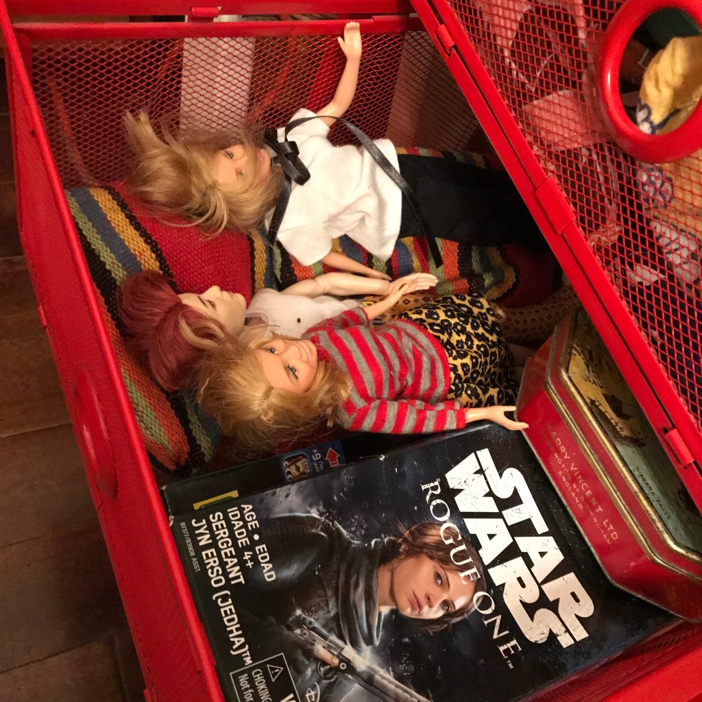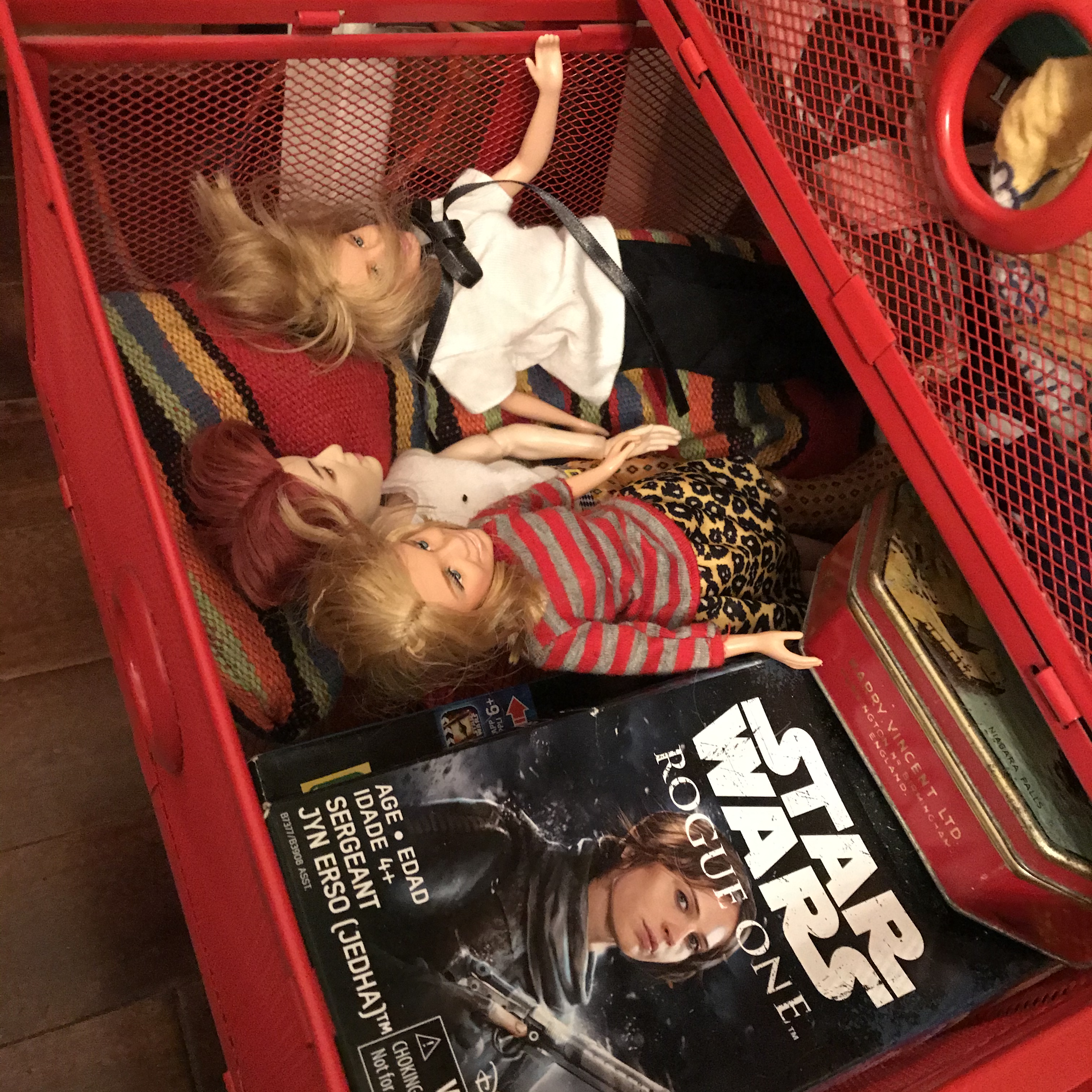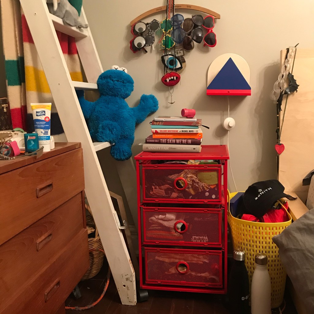 It was the solution I didn’t know I was looking for. First of all it’s on wheels so I can access our under bed storage. Secondly, because it’s red and IKEA, it matches my retro bed light. Thirdly, it offers ample storage space for things that I had stashed in baskets and bags, but the mesh construction lets me see what’s in each drawer without having to open them.