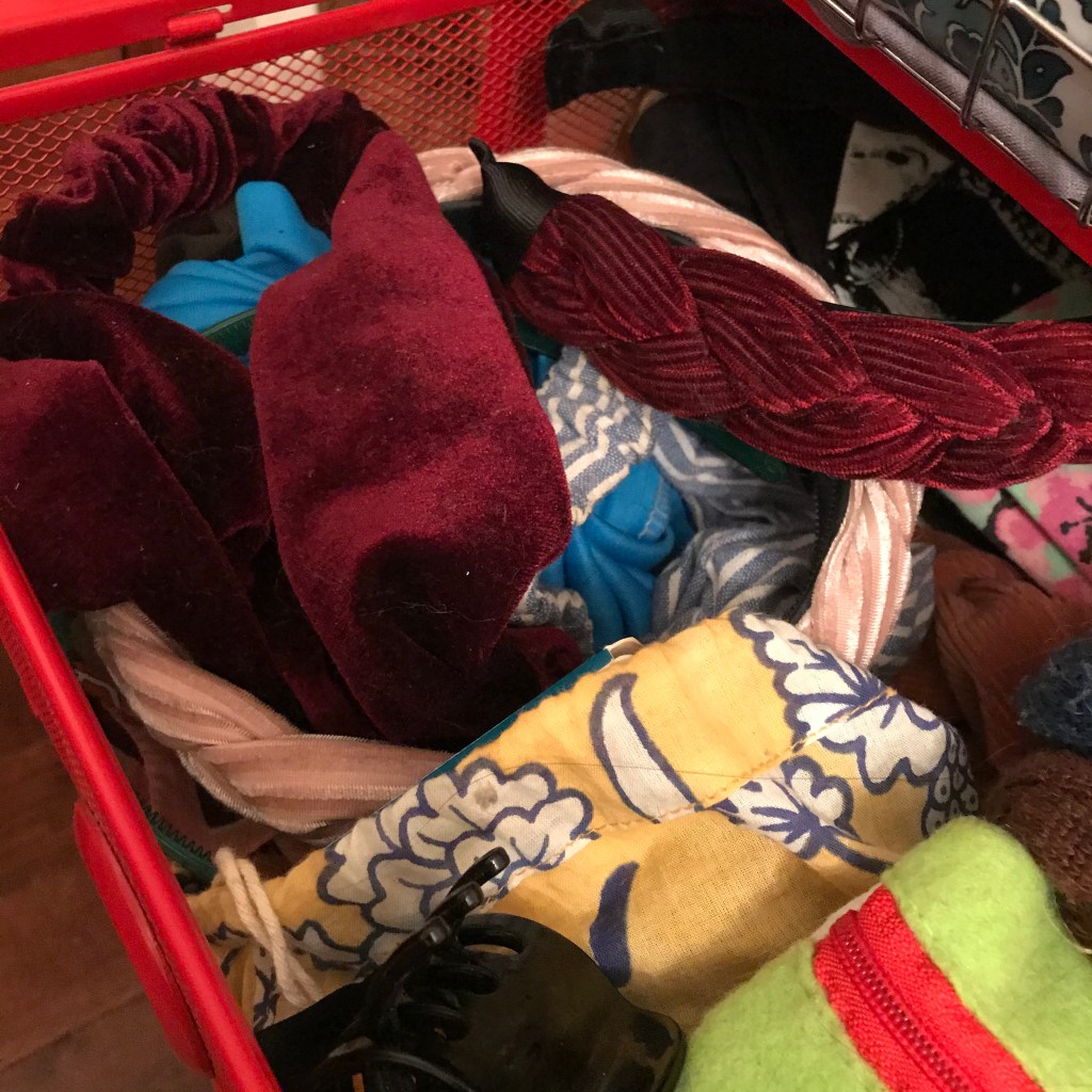 The top drawer is dedicated to headbands, Kerchiefs, turbans and hair-related accessories. The middle drawer is home to dolls and other toys. And the bottom tier contains scarves, scarves and more scarves.