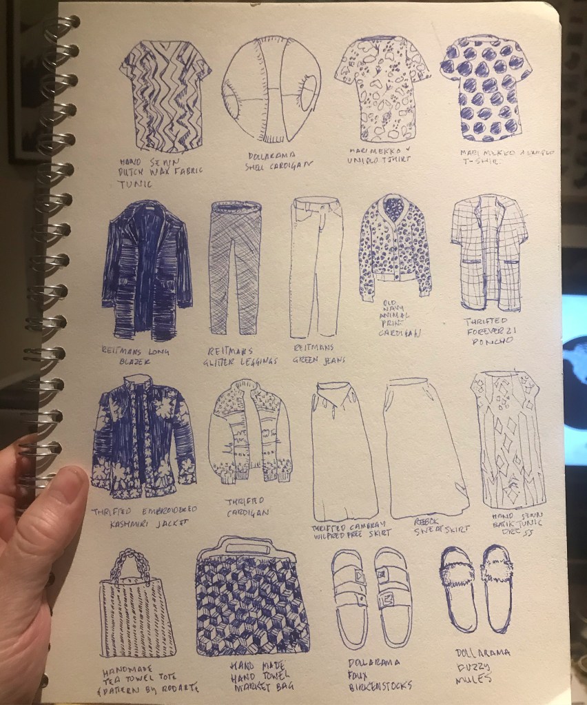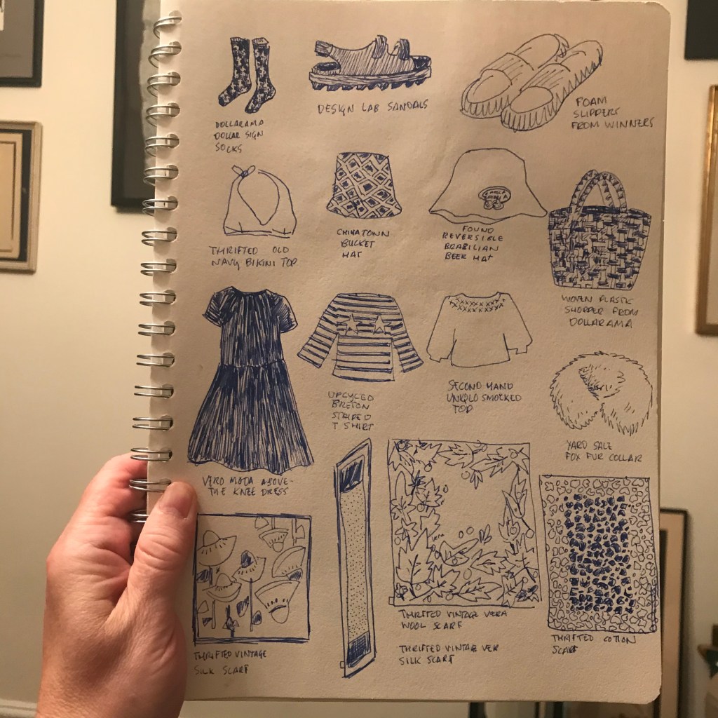 Clearly climate change is real and the fashion industry has a big impact on the environment and the health of people who make our clothes. Clothes play a big part of my identity — especially how I express myself. I like to think that because I upcycle and buy vintage that my conspicuous consumption is not so bad. Still, I decided to draw every item of clothing that I added to my wardrobe over the pandemic as a way of meditating on my habits. I started with things I bought in New York on March 13 — the day they shut Broadway down — to things I acquired this week. We are teetering on the edge of another lockdown so I may have to add to this accounting down the road.