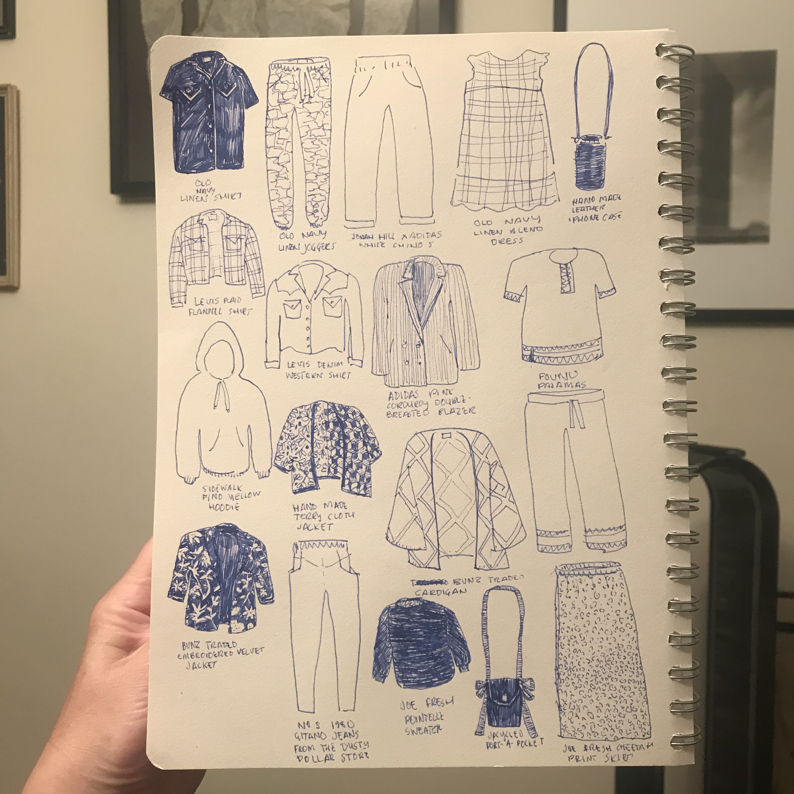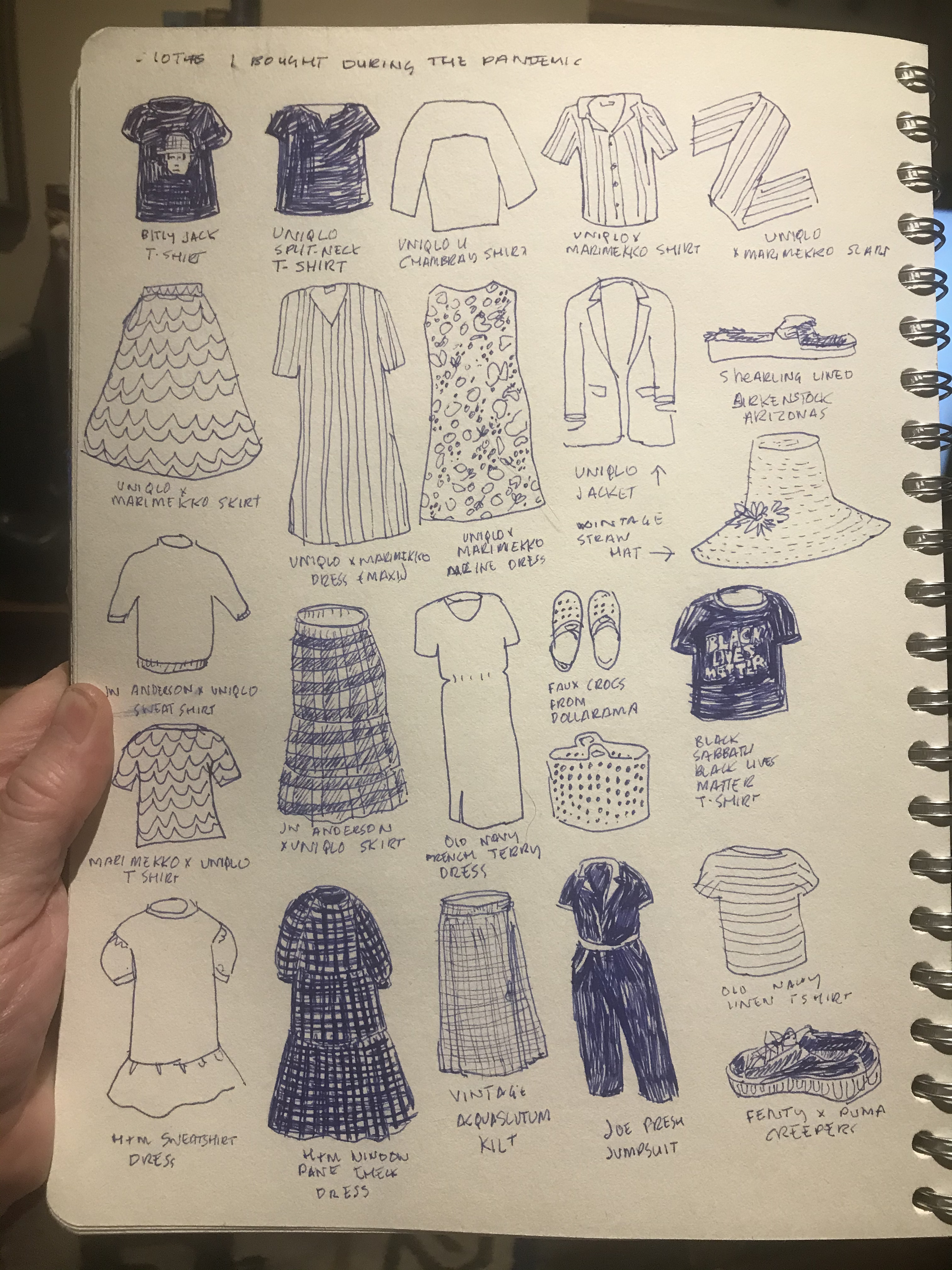 Clearly climate change is real and the fashion industry has a big impact on the environment and the health of people who make our clothes. Clothes play a big part of my identity — especially how I express myself. I like to think that because I upcycle and buy vintage that my conspicuous consumption is not so bad. Still, I decided to draw every item of clothing that I added to my wardrobe over the pandemic as a way of meditating on my habits. I started with things I bought in New York on March 13 — the day they shut Broadway down — to things I acquired this week. We are teetering on the edge of another lockdown so I may have to add to this accounting down the road.