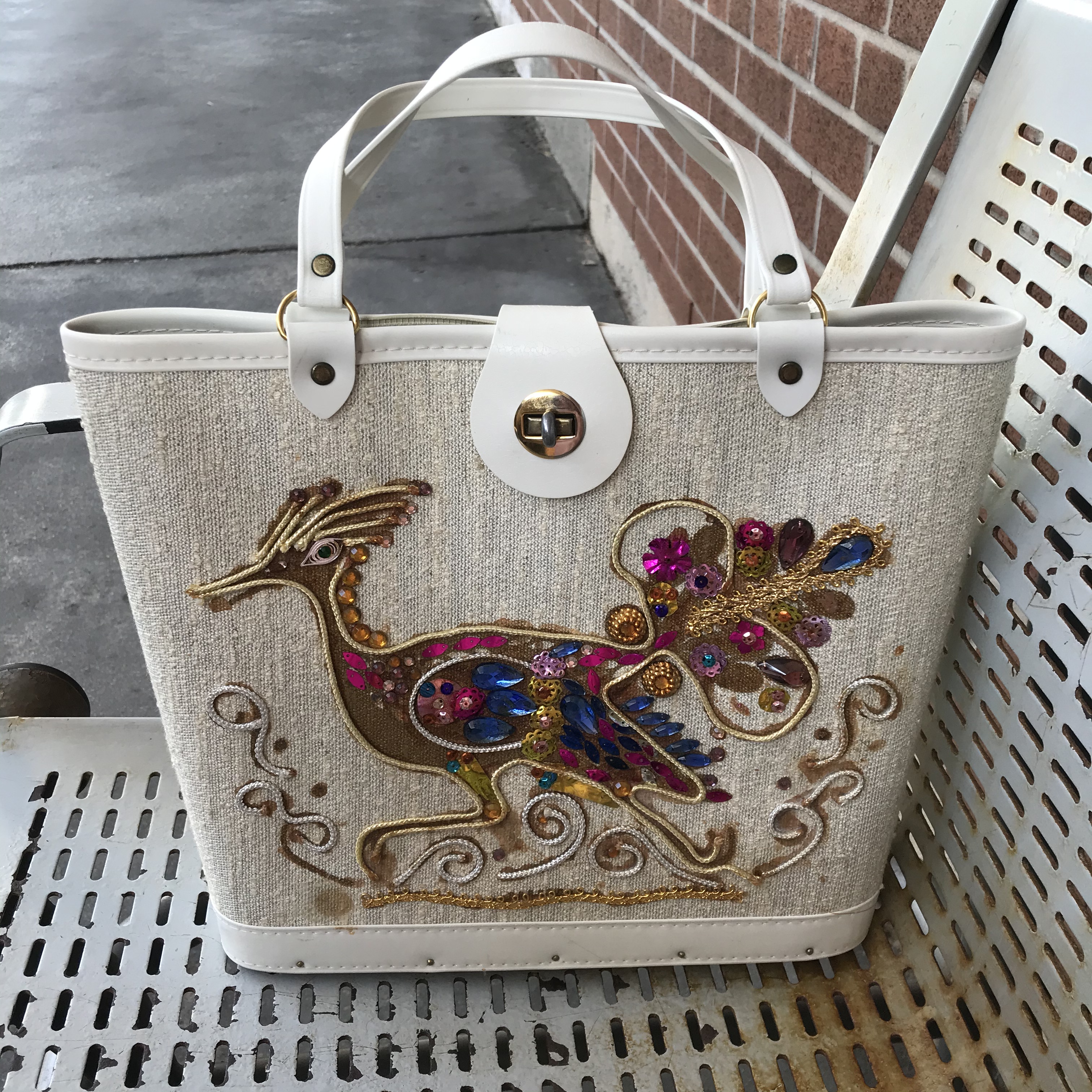 I also picked up this Enid Collins-style canvas tote. In the 1960s and 1970s you bought these bags with the design screen printed on and a bag of jewels and other findings that you could use to glue over top — kinda like a paint by number but with bedazzling.
