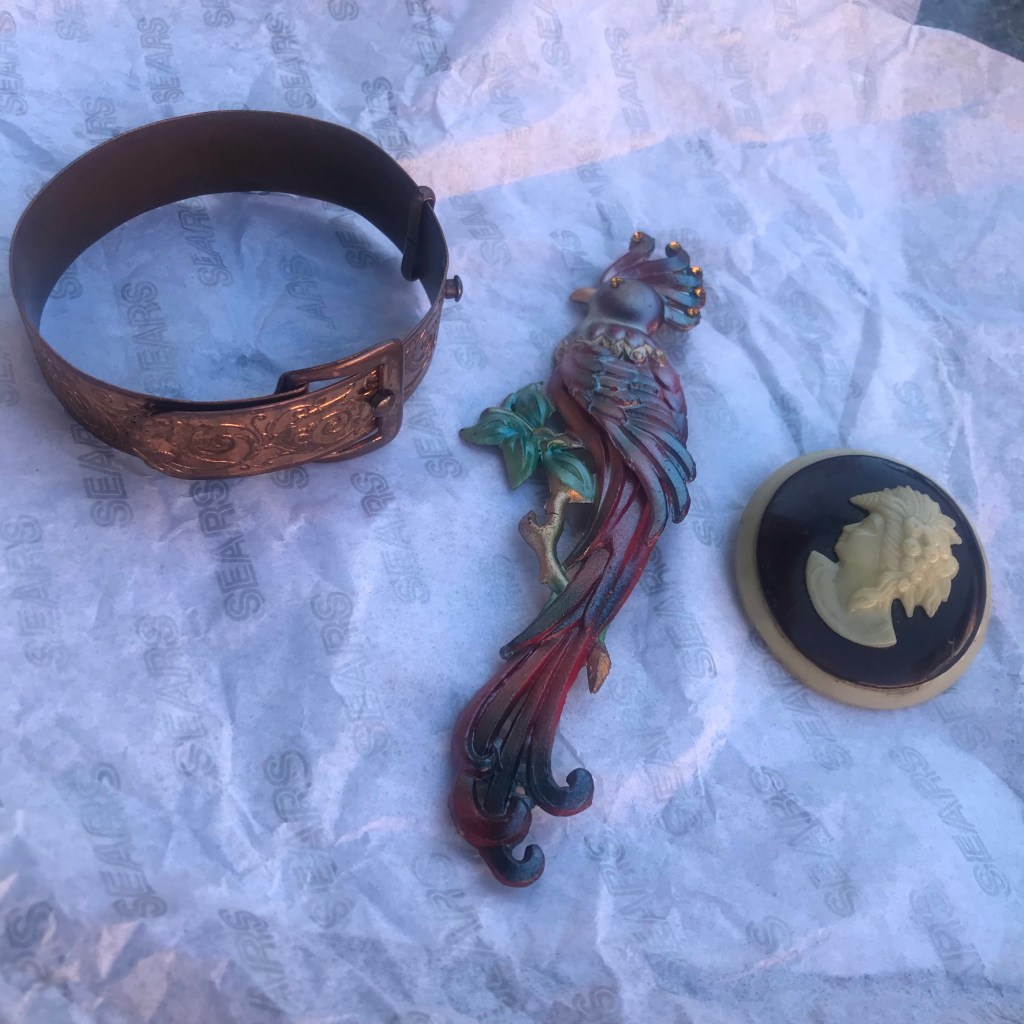 We also stopped by Edna’s Oddments which is the shop where I found my first Rolex on a bag of broken jewelry. This time I purchased a possible Coro pot metal brooch, a celluloid Demeter cameo and a Victorian Revival belt buckle bangle.