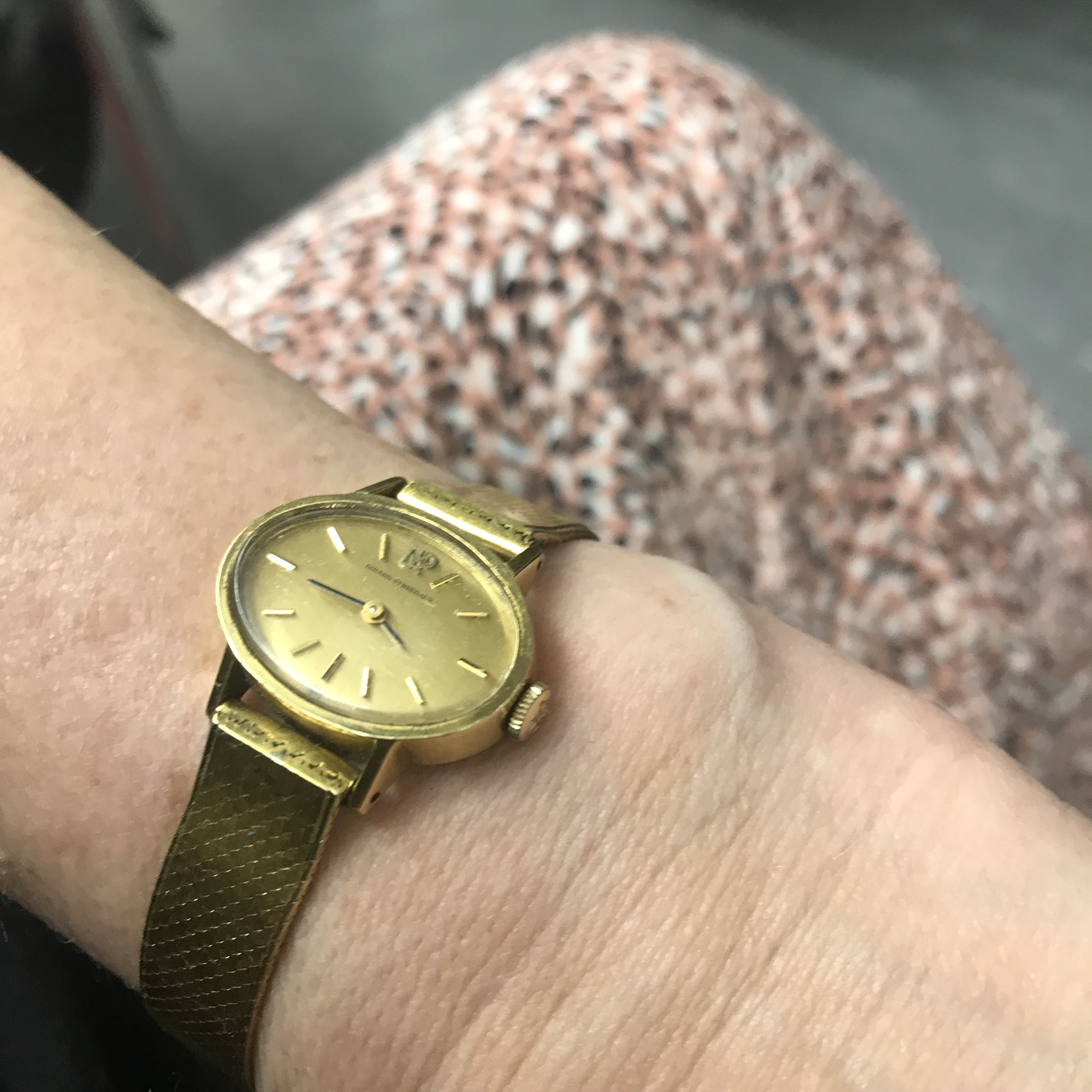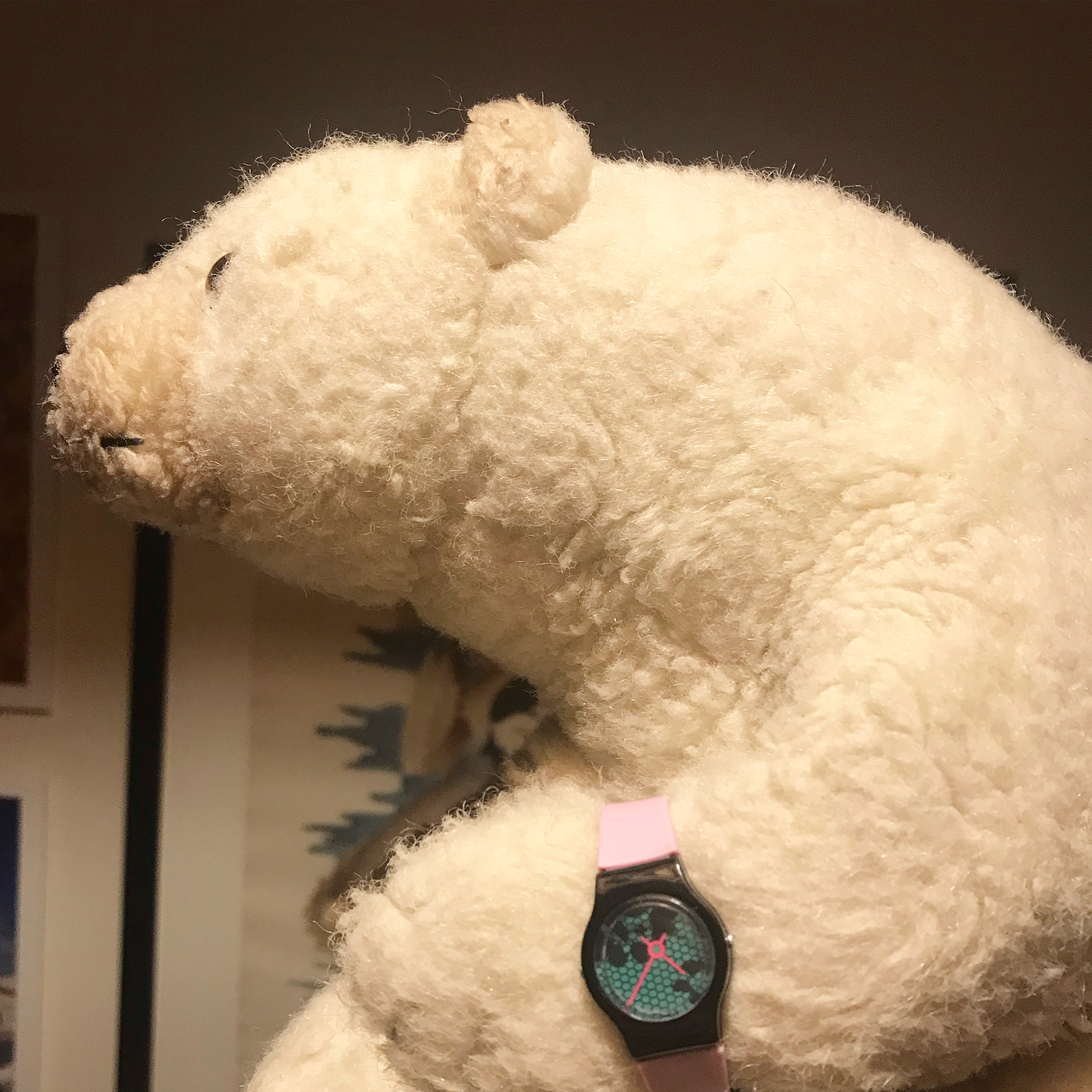 And I did find a watch. A groovy timepiece by a German brand called Kasper that works and was priced at just $3.99! I also found a mini faux Swatch for Ossington Bear.