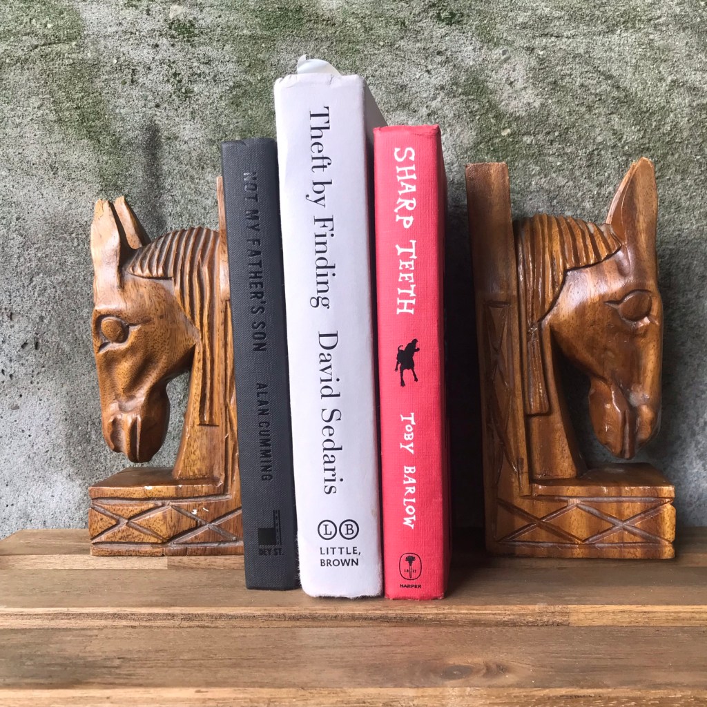 - Wooden, hand carved horsehead bookends.