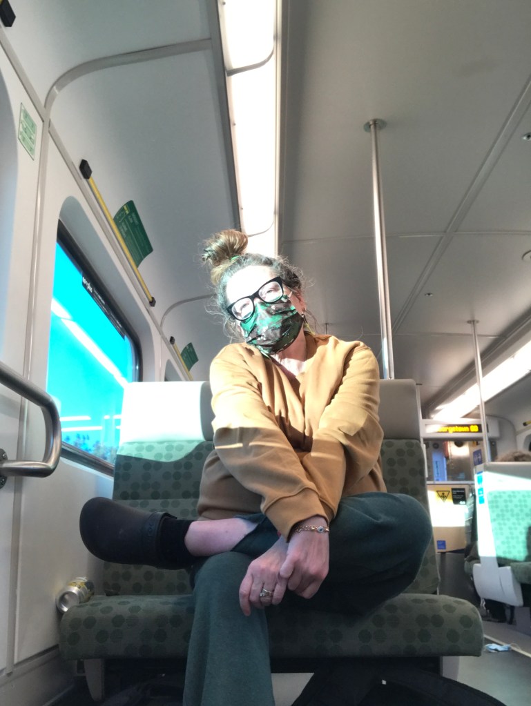 Here’s a picture of me taken at 7am on Monday. I am on the commuter train from Kitchener and I am wearing head-to-toe sweats in public. These details are offered up as proof that I am not the same person I was two years ago. Old Rhonda would not go out dressed so casually. Nor would she allow her pre 10 am self be documented,