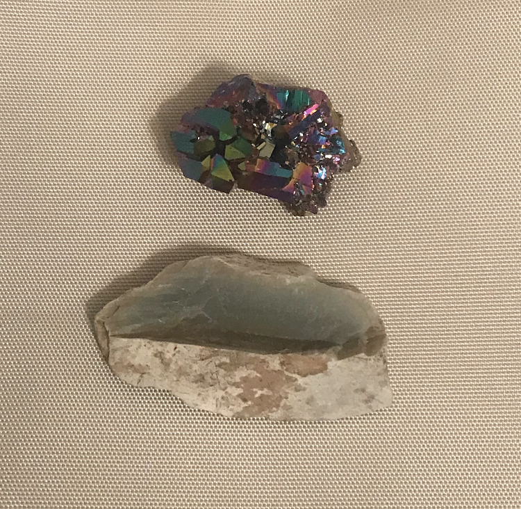 Here ate some recent rock acquisitions. Pictured up top is a titanium coated quartz (the rainbow effect is not found in nature) and a stone my sister picked up for me in Death Valley a few years ago (but that she kept forgetting to give me.