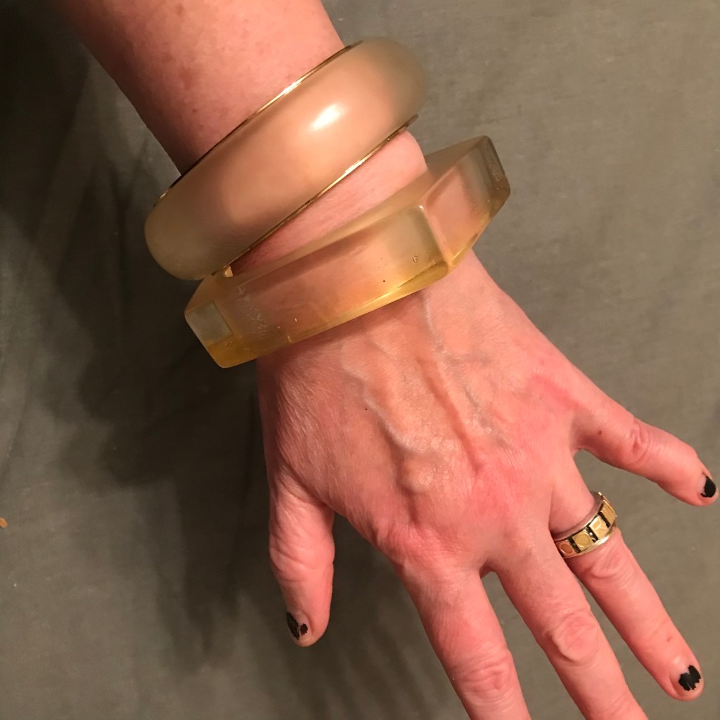 I tore the place apart looking for it. The watch still hasn’t turned up, but I discover these two resin bangle beauties. I started snapping up translucent and transparent jewels about 10 years ago when my friend Samra Habib asked me if I had any that she could borrow for a photo shoot. I was embarrassed because I had none.