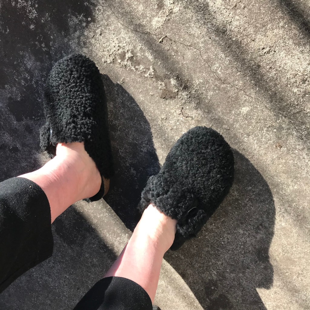 My ongoing Poshmark journey is mostly focu on reselling my old stuff to keep clothes in circulation and out of landfills. I have, on ccasion, bought things on Poshmark. My latest purchase: these shearling Papillio by Birkenstock platform Boston mules.