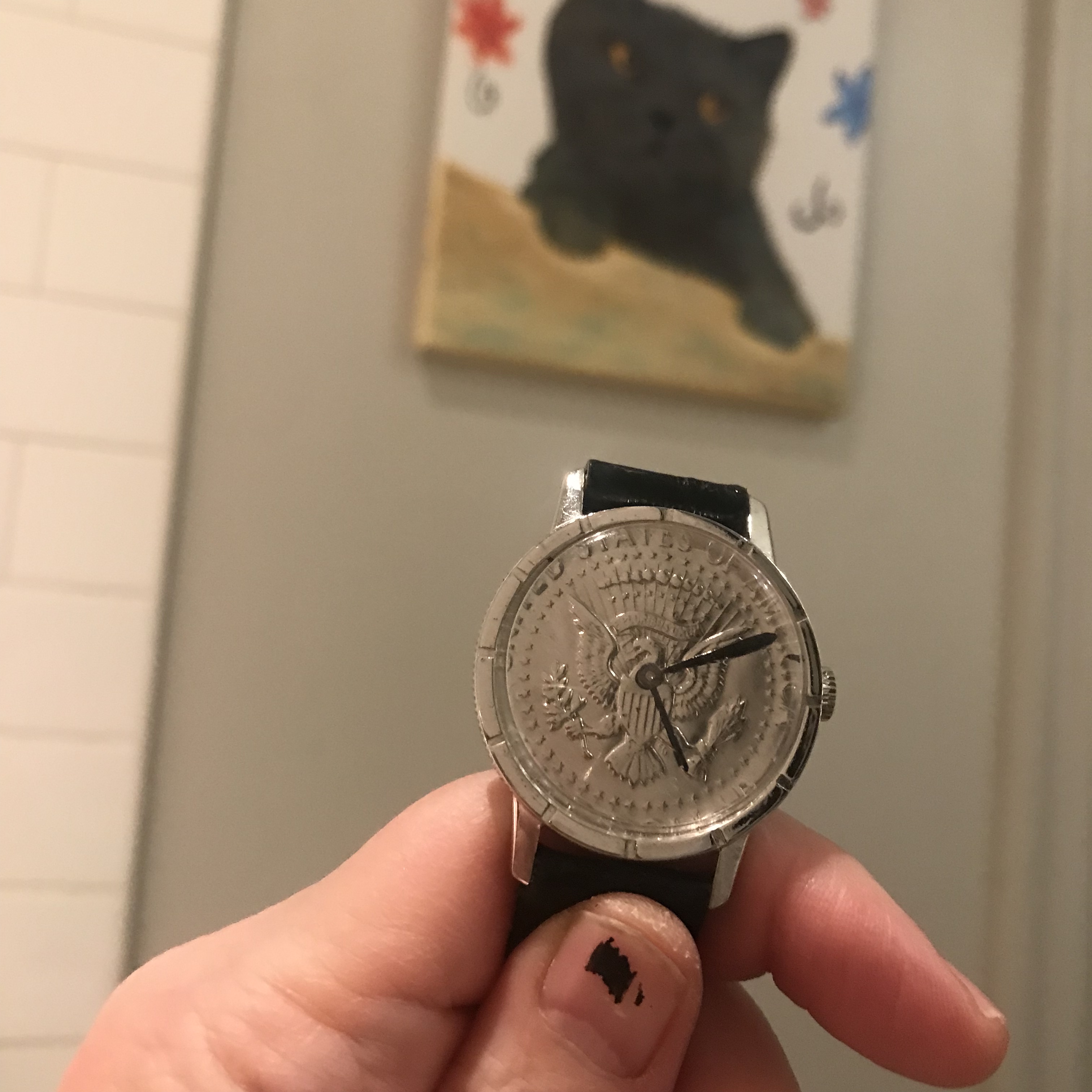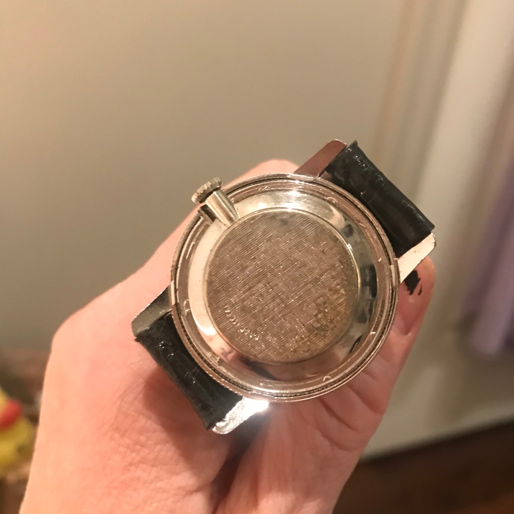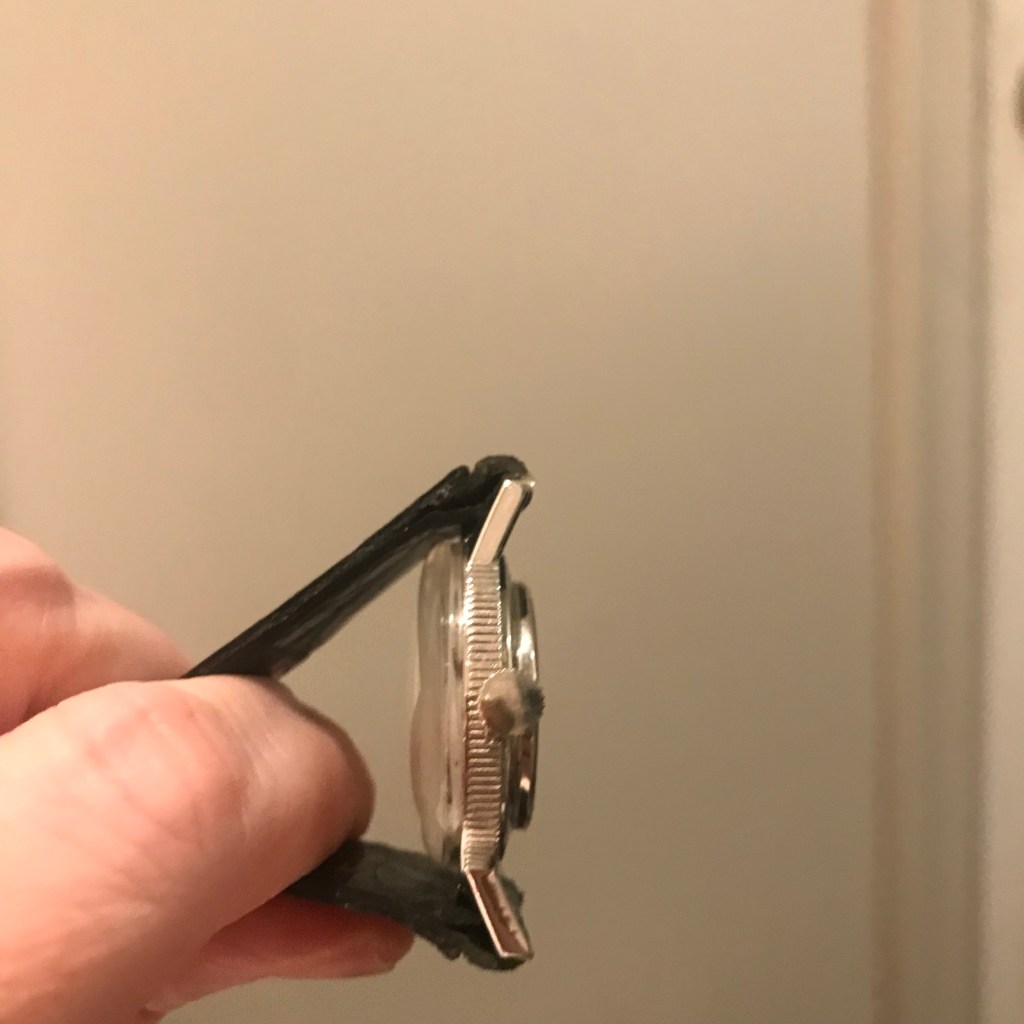 I believe this dial is a real coin—you can make out a bit of engraving and the coin edge on the back. I lucked out because even though it has a base metal case and acrylic crystal, it still in very good cosmetic condition. And it keeps good time. It now joins my Tissot Rock Watch and Bill Blass stamp watch as examples of my hobby within a hobby.