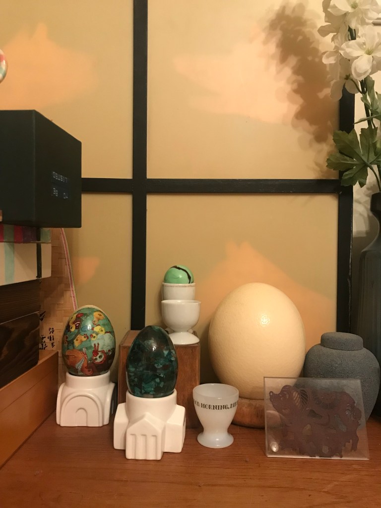 I stopped by the Salvation Army thrift shop whilst waiting to pick up our NYE dinner and picked up these egg cups. They make good bases for egg- and globe-shaped rocks and other objects. The milk glass cup was esp Irresistible because it has “Good Morning, Deiter” printed on it.
