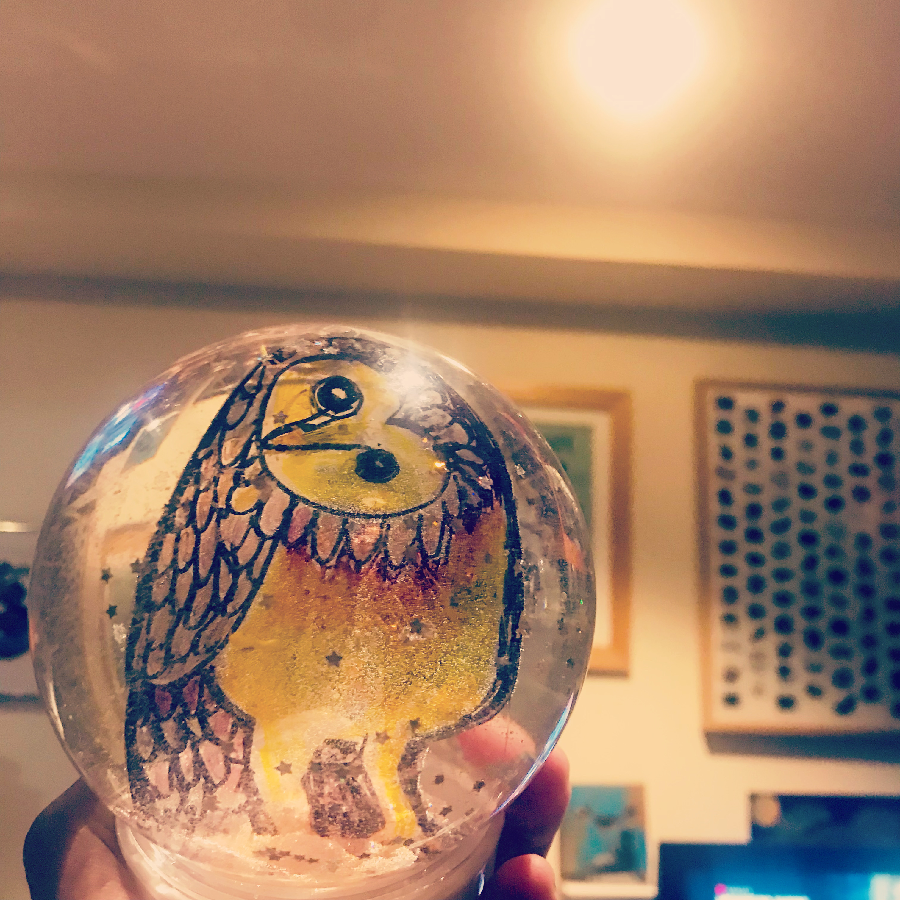 I bought the materials to make a snowglobe at the Dollarama over a year ago. The problem was that I could never settle on what message would I choose to encase in sparkly fluid. I was leaning toward some sort of clever slogan that end all war and solve hunger, but instead I went the wholesome route and made a shrinky dink of an owl.
