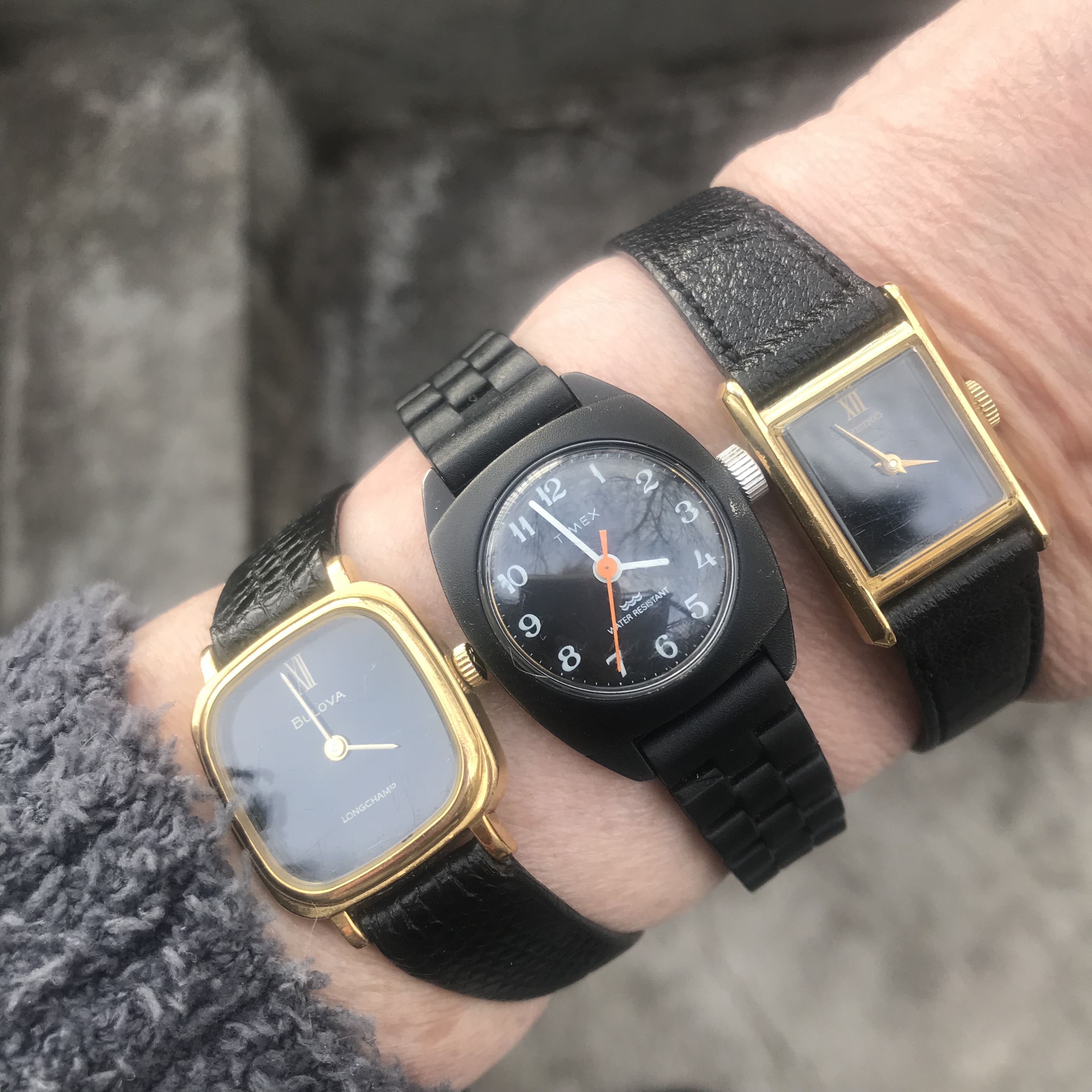Take, for example, these three recent basic black vintage watch acquisitions (pictured above). From left to right is a Bulova Longchamp I bought on Poshmark, a Timex I won on eBay and a Seiko I purchased at the Value Village.