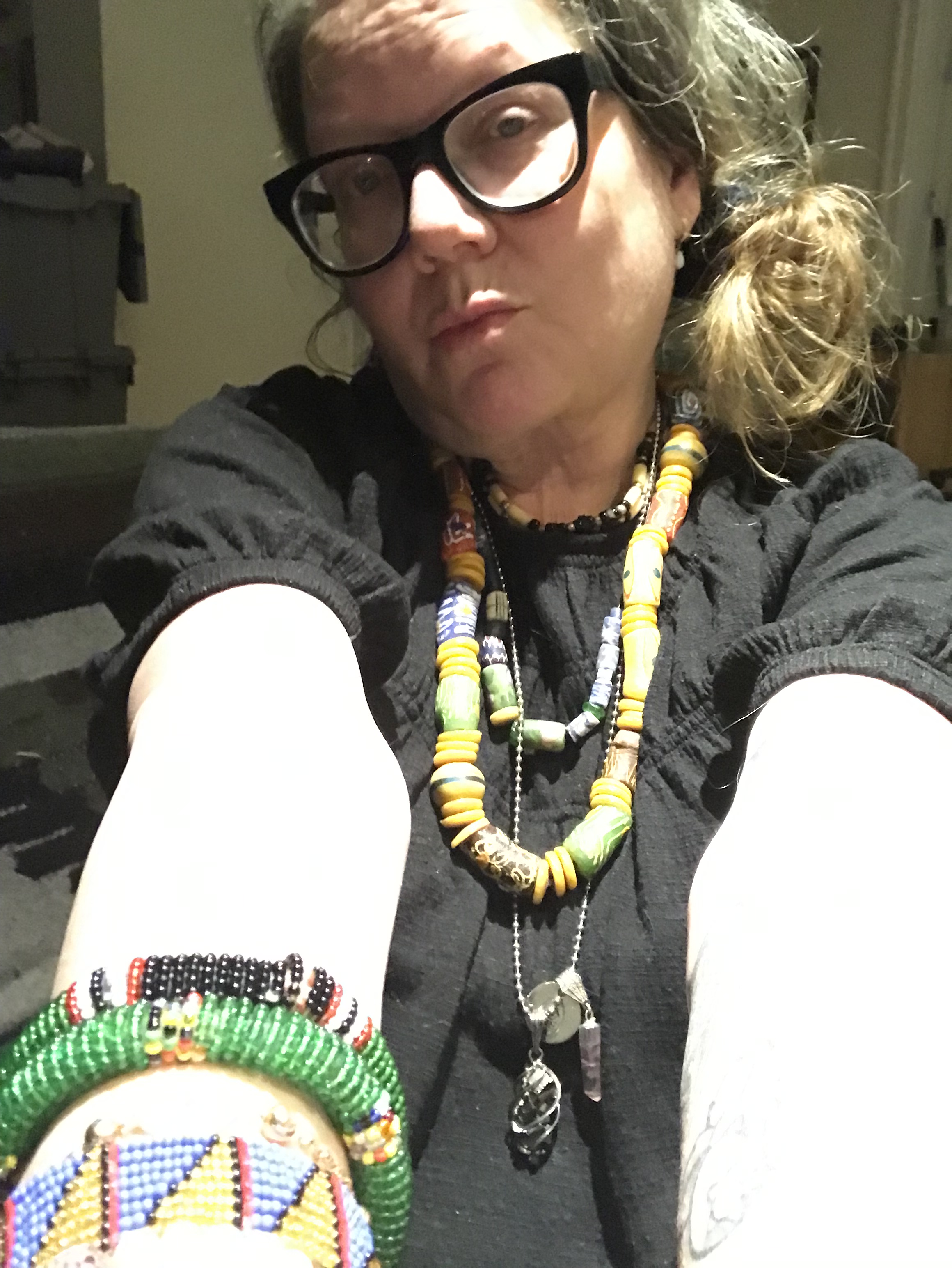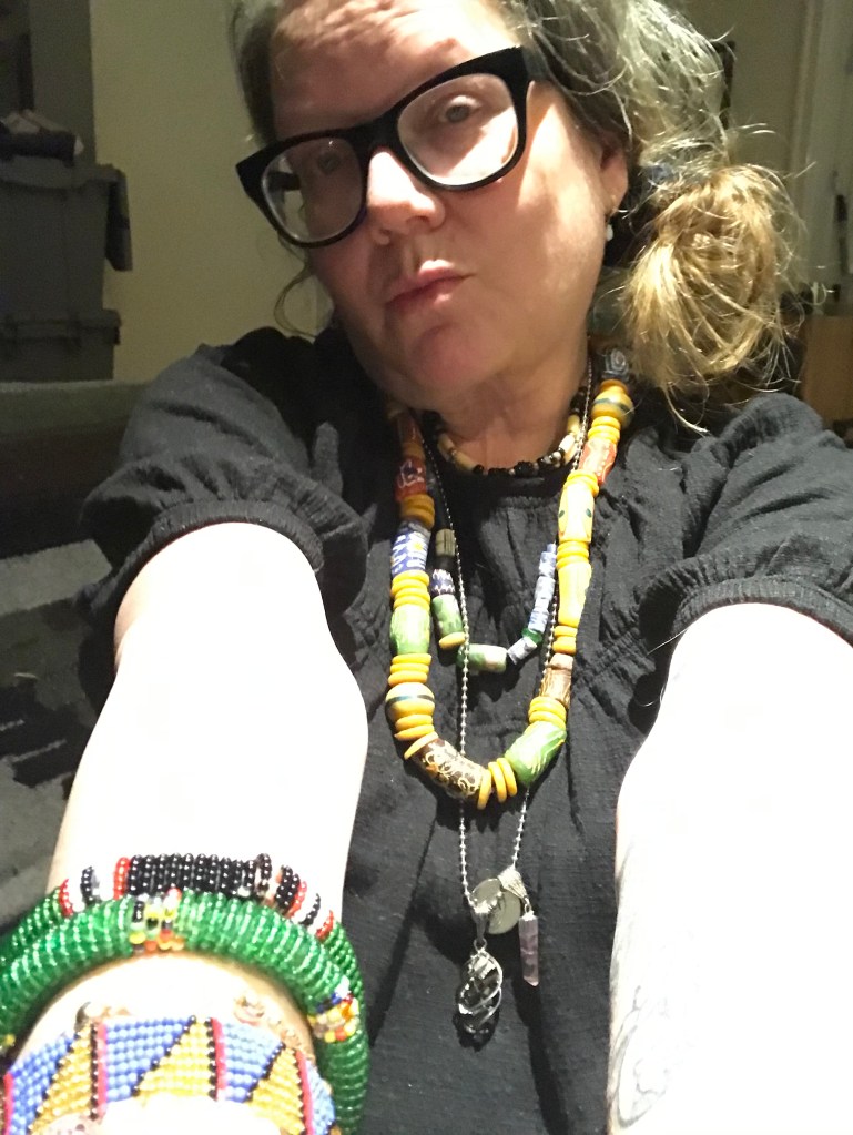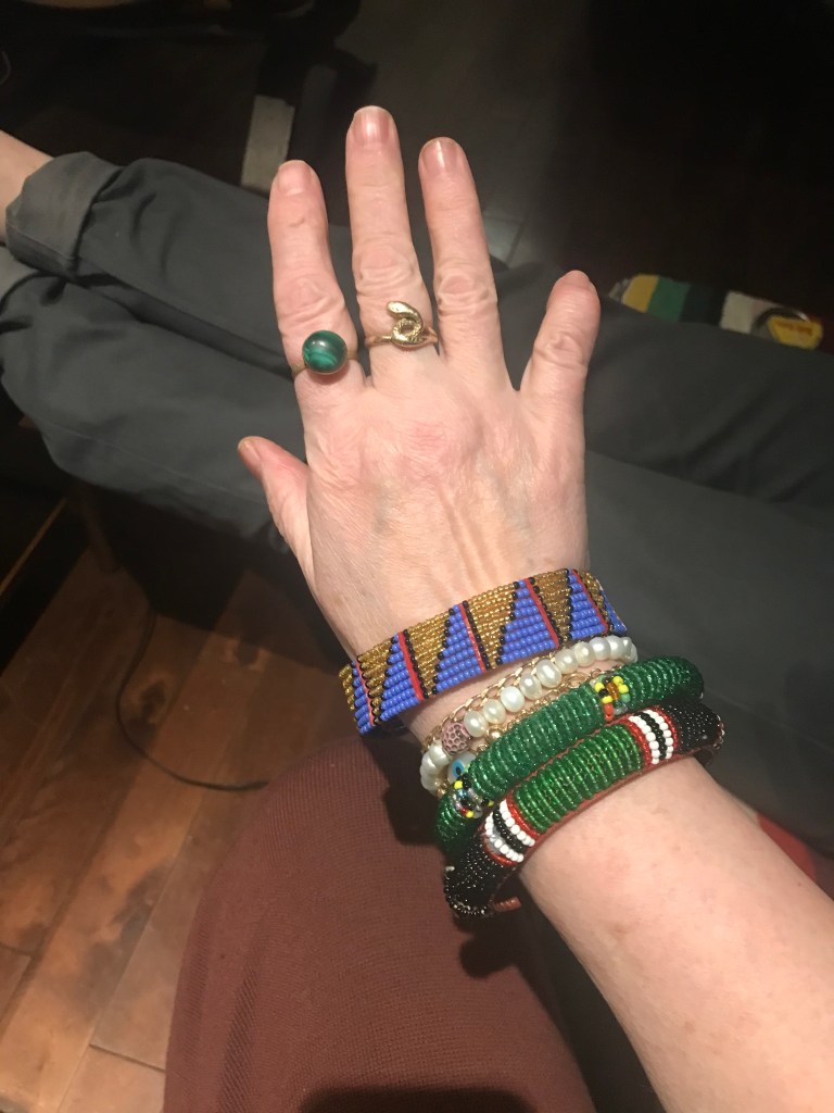The last two years have taken some of the thrill from the hunt. I get sweaty shopping now and I strongly dislike feeling damp. I don’t have the same patience for examining the shelves for overlooked treasure. on the plus side, unusual objects still manage to catch my eye. On this trip I found some beaded bangles, three glass trade bead bracelets that I restrung as a necklace, and a caged hematite crystal pendant that I added to a chain that already had other charms on it. These purchases provided triple fun because I got to shop, do some DIY, and play dress up by piling them all on à lá Iris Apfel.