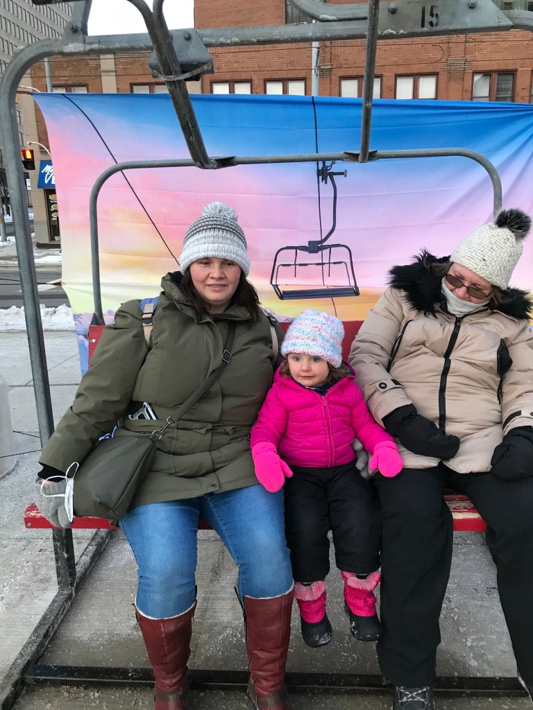 My sister Bobbi, niece Sarah and great niece Chloe organized an afternoon of outdoor activities. It was super cold but also so invigorating to be outdoors breathing in fresh air and to be moving around in general. Besides, I am too hot most of the time anyway.