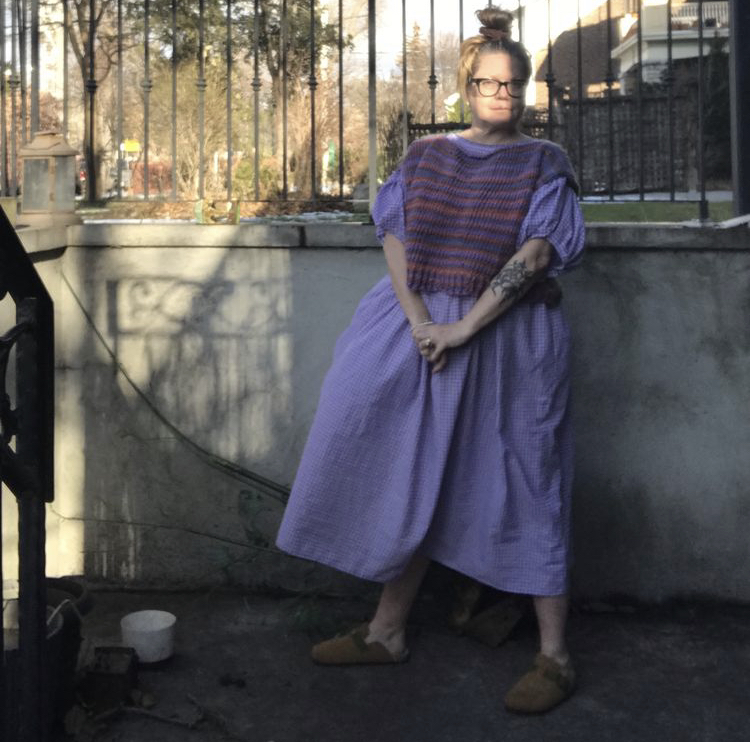 This lounge dress was made from off cuts that I bought from an alterations place at Kipling station. The vest was knitted from yarn I found in a free basket on the sidewalk.
