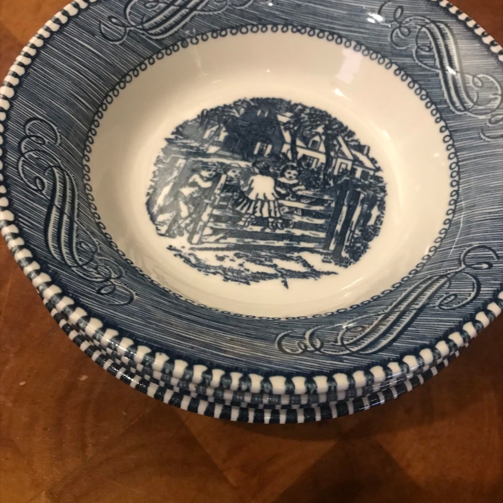 Last week another saucer got smashed, so I went to the Value Village hoping that the Universe would provide at least some bowls that matched the dimensions of Kitty’s dinner service if not the pattern. I got sort of lucky with a set of blue and white saucers with a colonial style decoration. And I also scored six Kathie Winkle cereal bowls which ate too big for the cat but purr-fect for us.