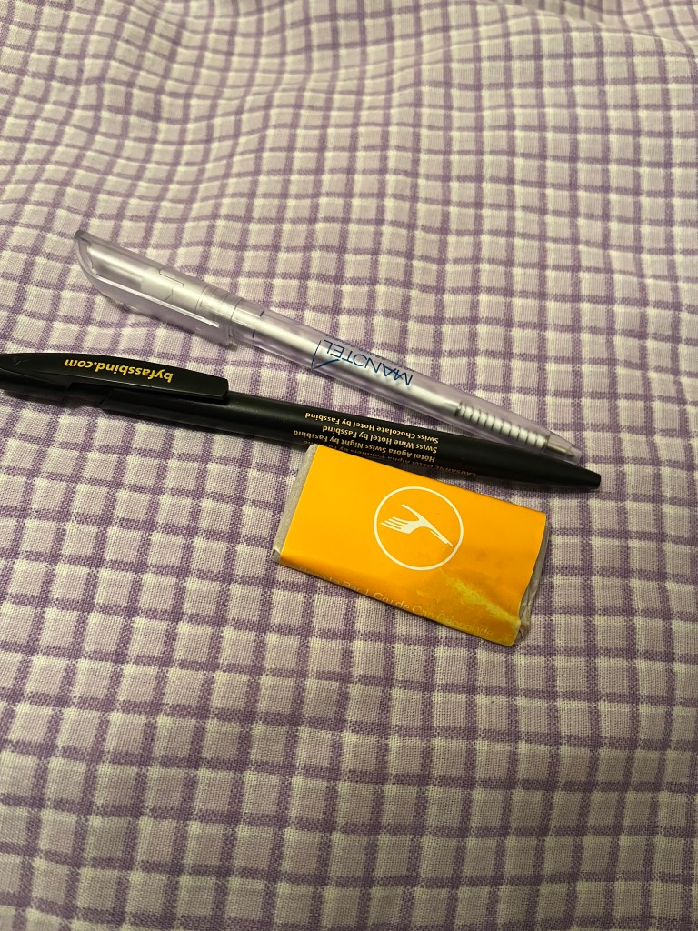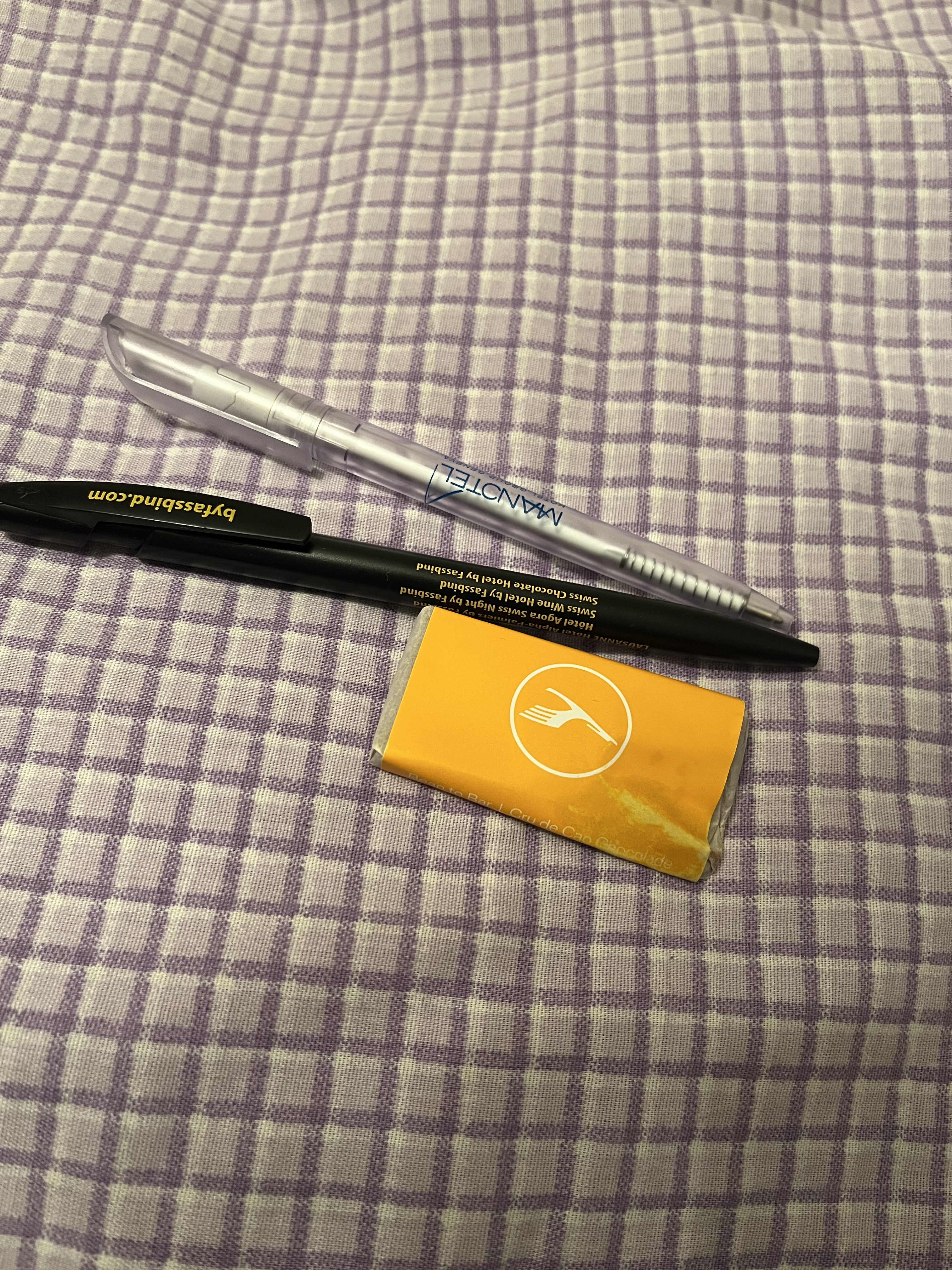 Two more pens to add to my collection of hotel room memoribilia plus the worst chocolate I ever ate, courtesy of Lufthansa. i should have been suspicious when the other passengers took a pass on them.
