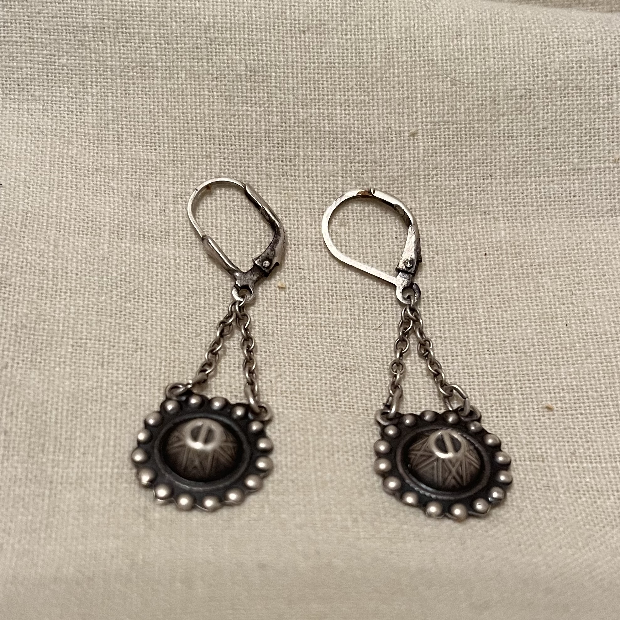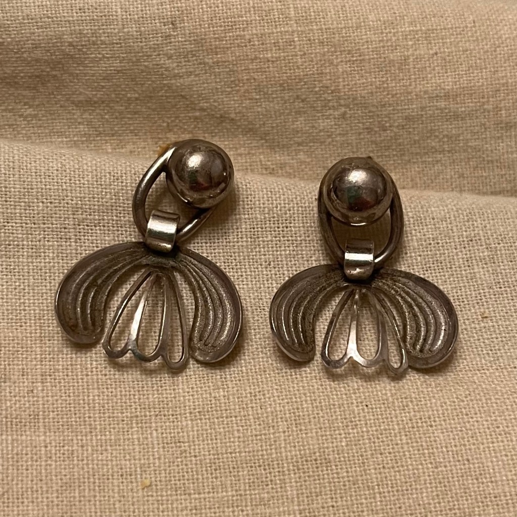 These sterling danglers were marked Coro Sterling, bit they were screw ons so I converted them to pierced earrings. I have a hunch that they are from the 1940s-era when Coro had a manufacture in Mexico.
