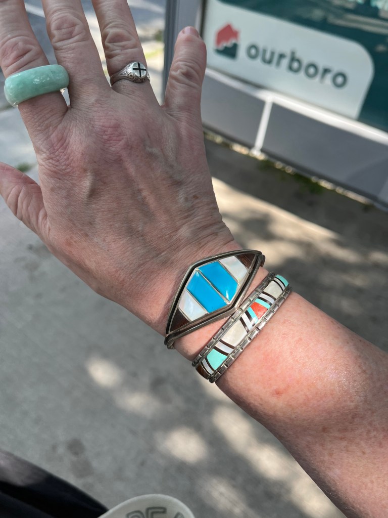 On the way to my mani, I made a quick stop into Loved And Found, a vintage and consignment shop in the Junction. They had many accessories that I admired but did not buy, but I could not resist the two Zuni inlay cuffs pictured up top. One is signed AD and the other is in the style of Marvin Luarkie.