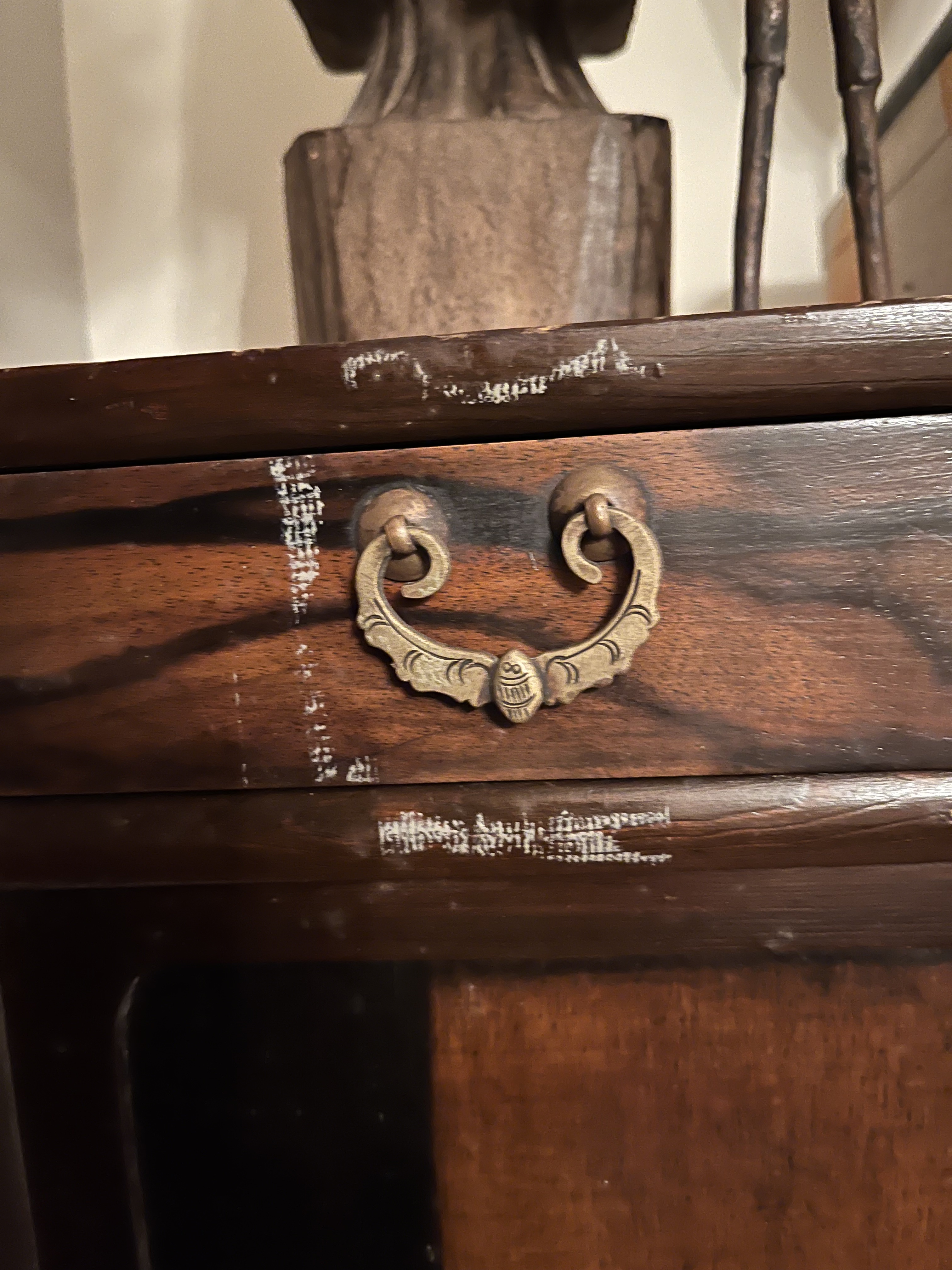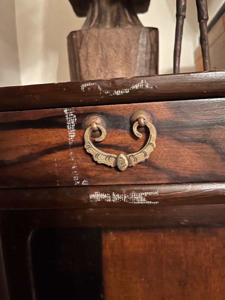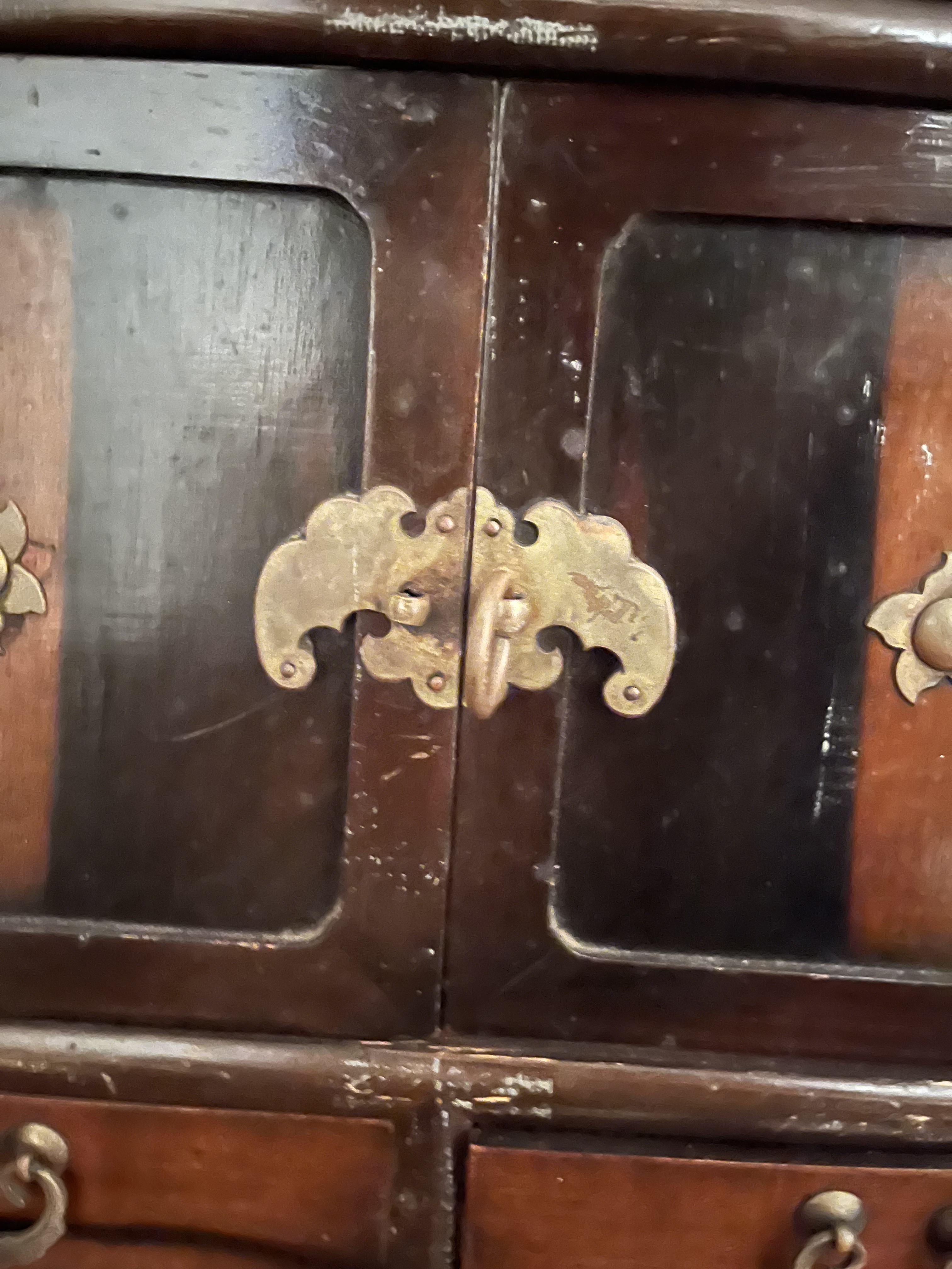 As you can see, it needs a little work. My neighbor says it was Korean and about 100 years old. Her husband practiced Chinese Traditional Medicine and used it to store his accupunture supplies. At some point someone taped it up to keep the drawers from opening up during a move so there’s a sticky residue that I’ll try and remove. If it doesn’t come off, I’ll add it to the many refinishing projects I’ve got lined up.