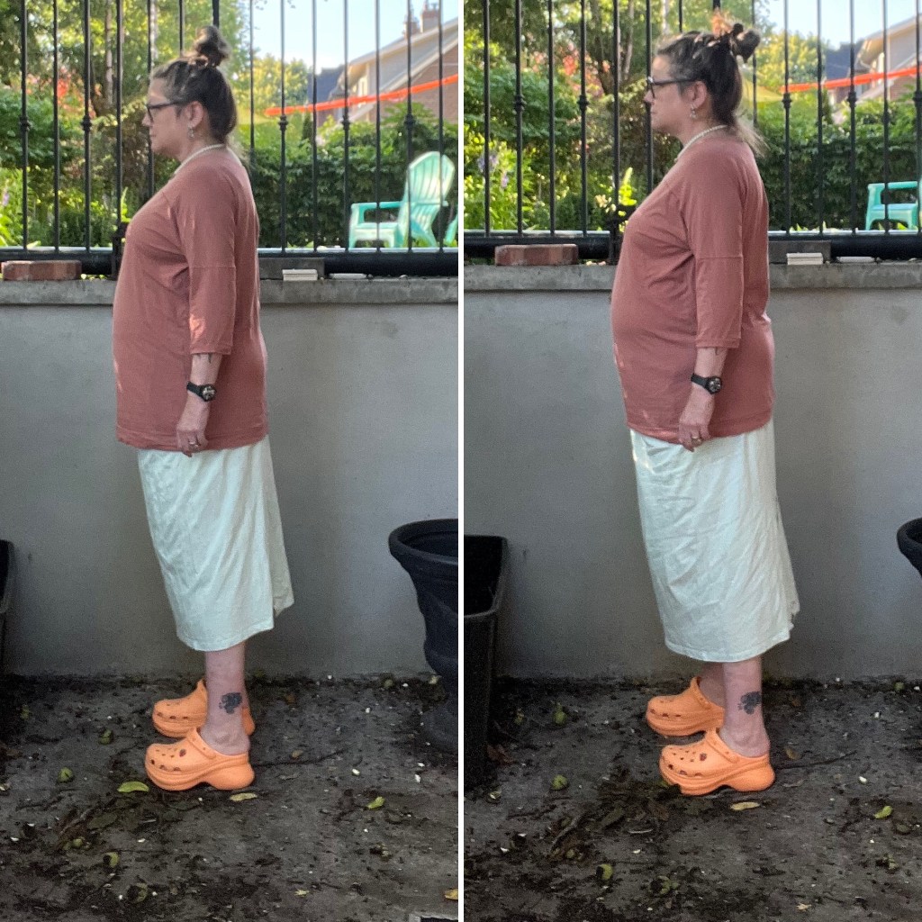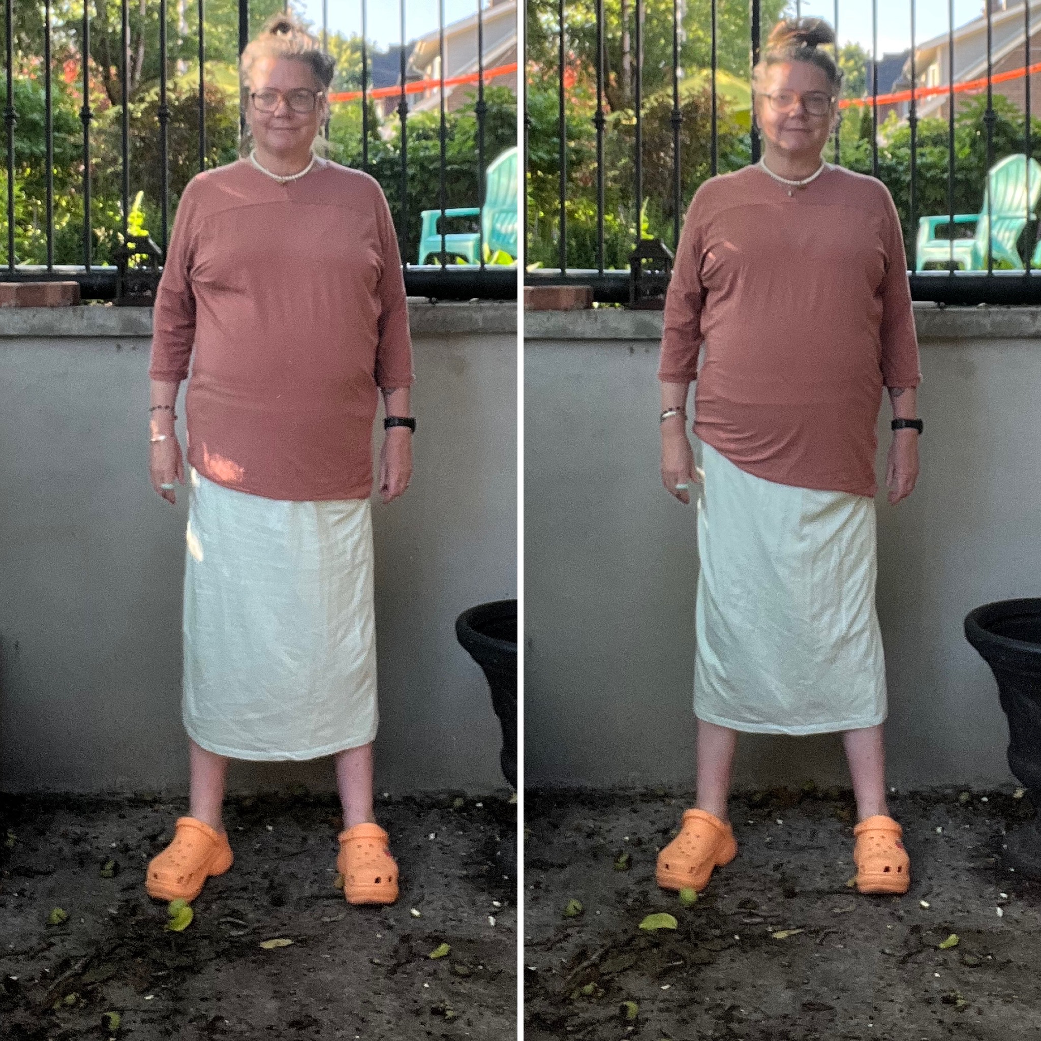 The Dollarama was selling shapewear so I bought a slip to see if it could help smooth out my silhouette. Here are the before and after photos.
