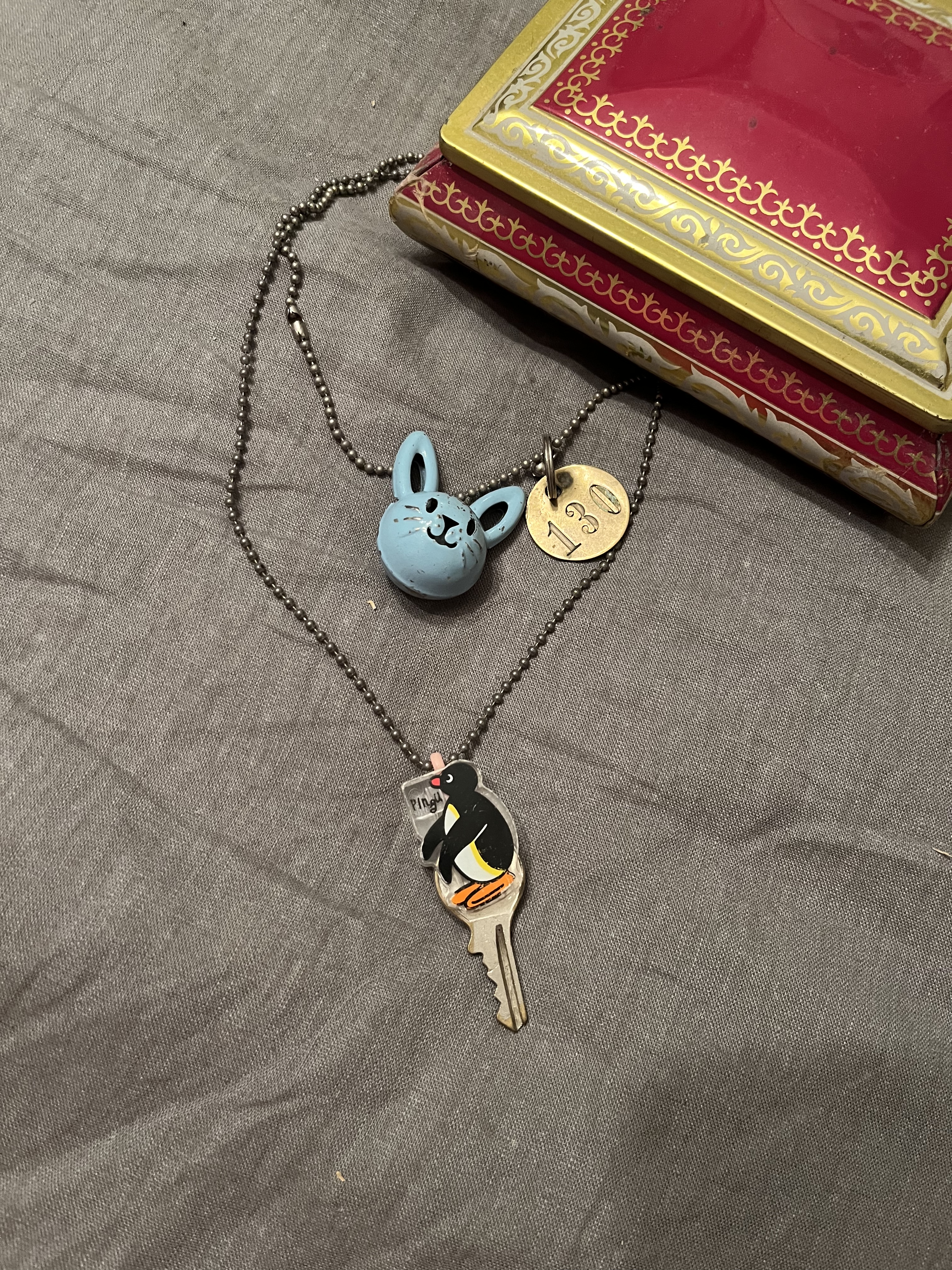 Up top are some pins that would have certainly studded my jean jacket. The second photo shows my favourite necklaces of that era: a blue enamel bunny bell that I got on a road trip to Knoxville, Tennessee; a brass coat check tag and a Pingu key guard that I think came in a Kinder Surprise. At the time, I was also predisposed to tying ribbons around my neck until they disintegrated.