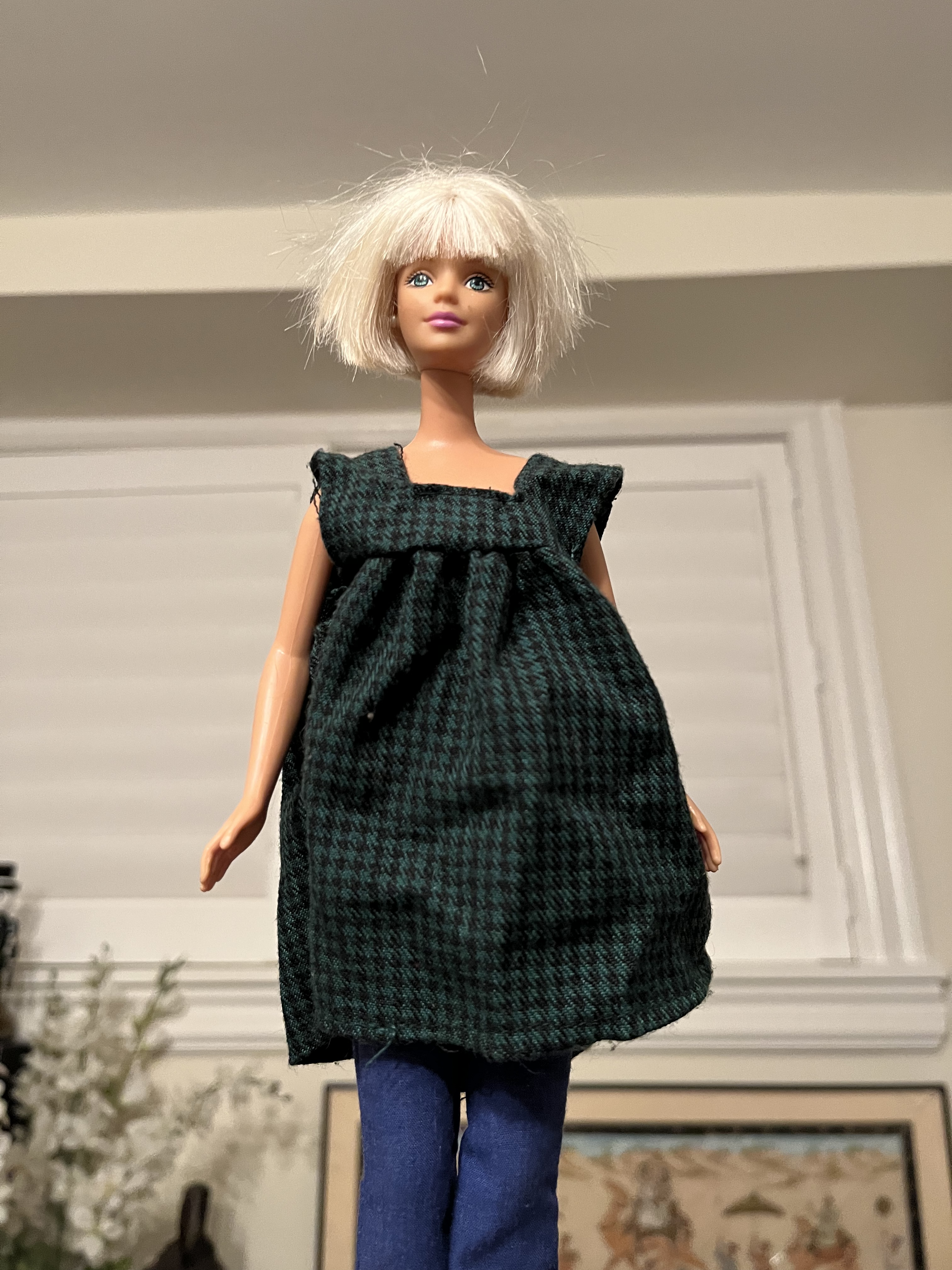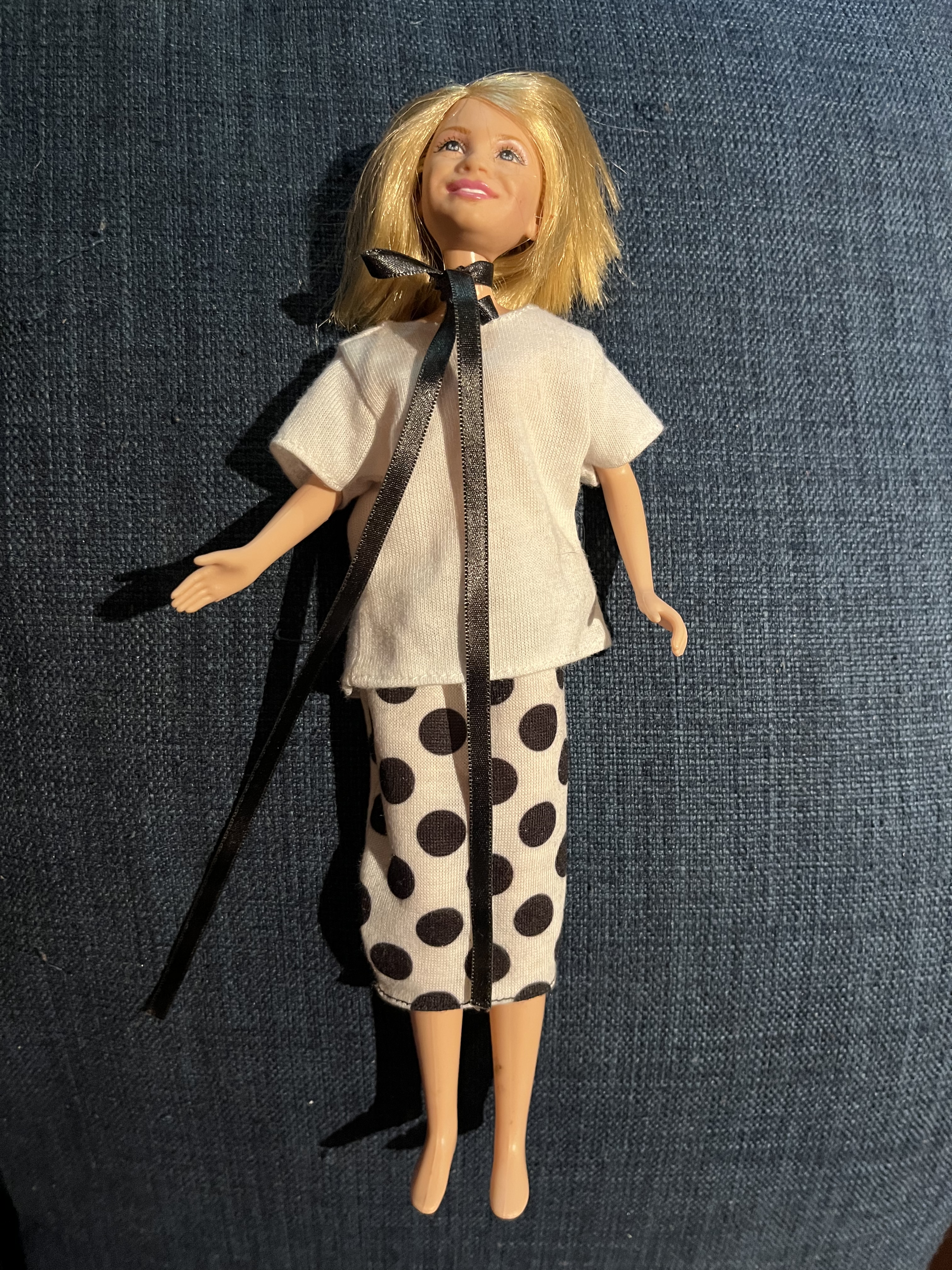 There was also a 1999-era Barbie in the box. She came dressed in flares and a pink hoodie, but I restyled her in a dress-over-pants situation, which is one of my personal signatures.