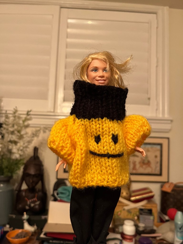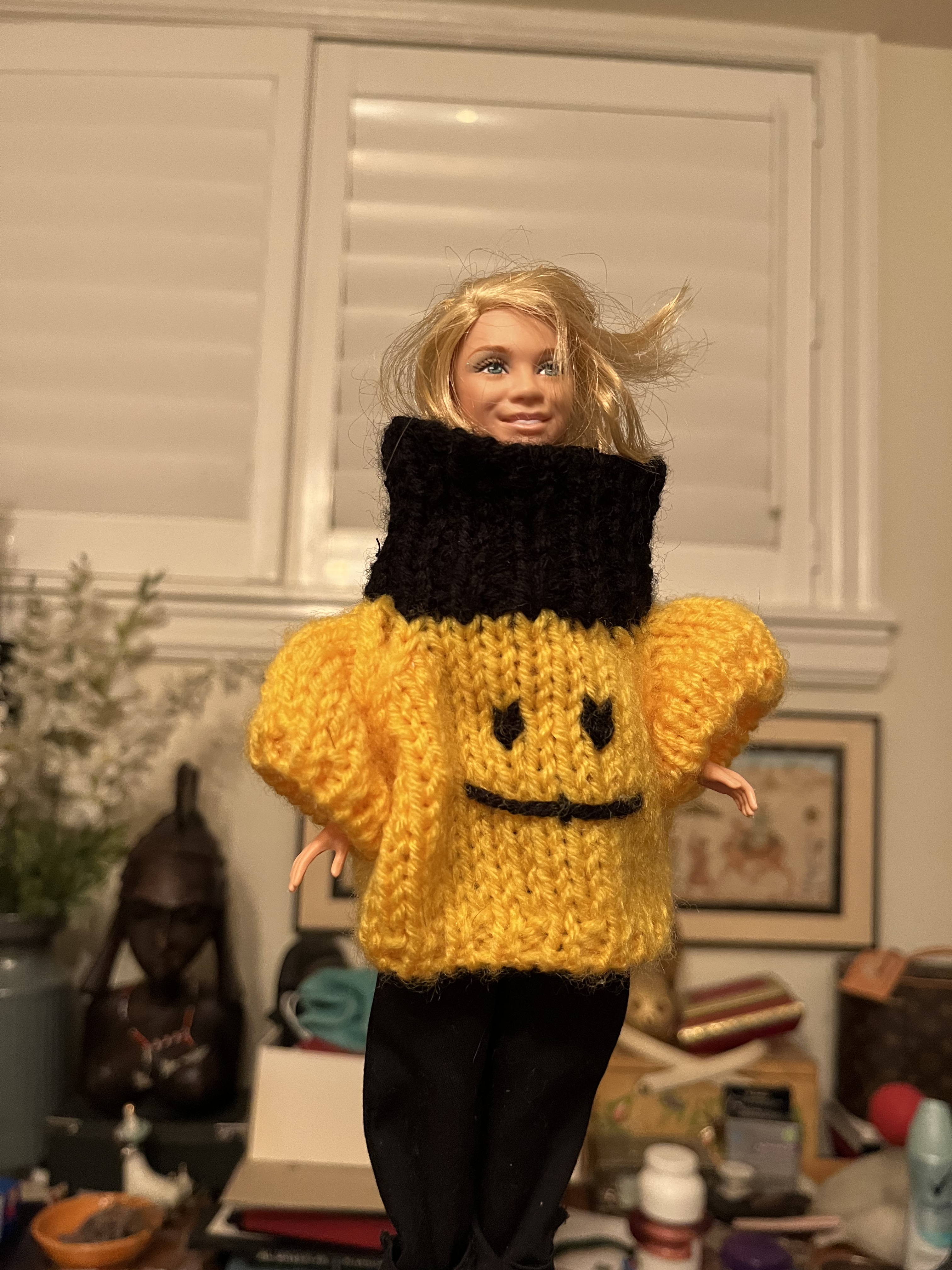 The universe recognized my new calling as a doll stylist and while Mr. Andrew and I were out for an evening amble, we came across a free box of handmade doll clothes on the side walk. While some of the fits were set aside for Ossington Bear (I’ll share those tomorrow), the silhouette of this Smiley Face sweater seemed to fit The Row aesthetic. So I put it on MK.
