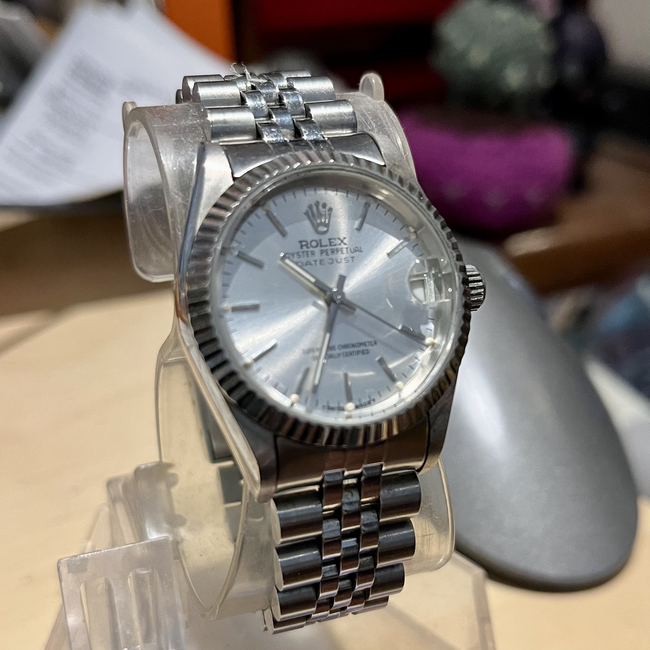And this almost passable Fauxlex. It is also an automatic and keeping good time. I am generally against fakes though I used to keep a very bad fake in my styling kit when I did wardrobe for TV. Because nobody was gonna lend me a real one.