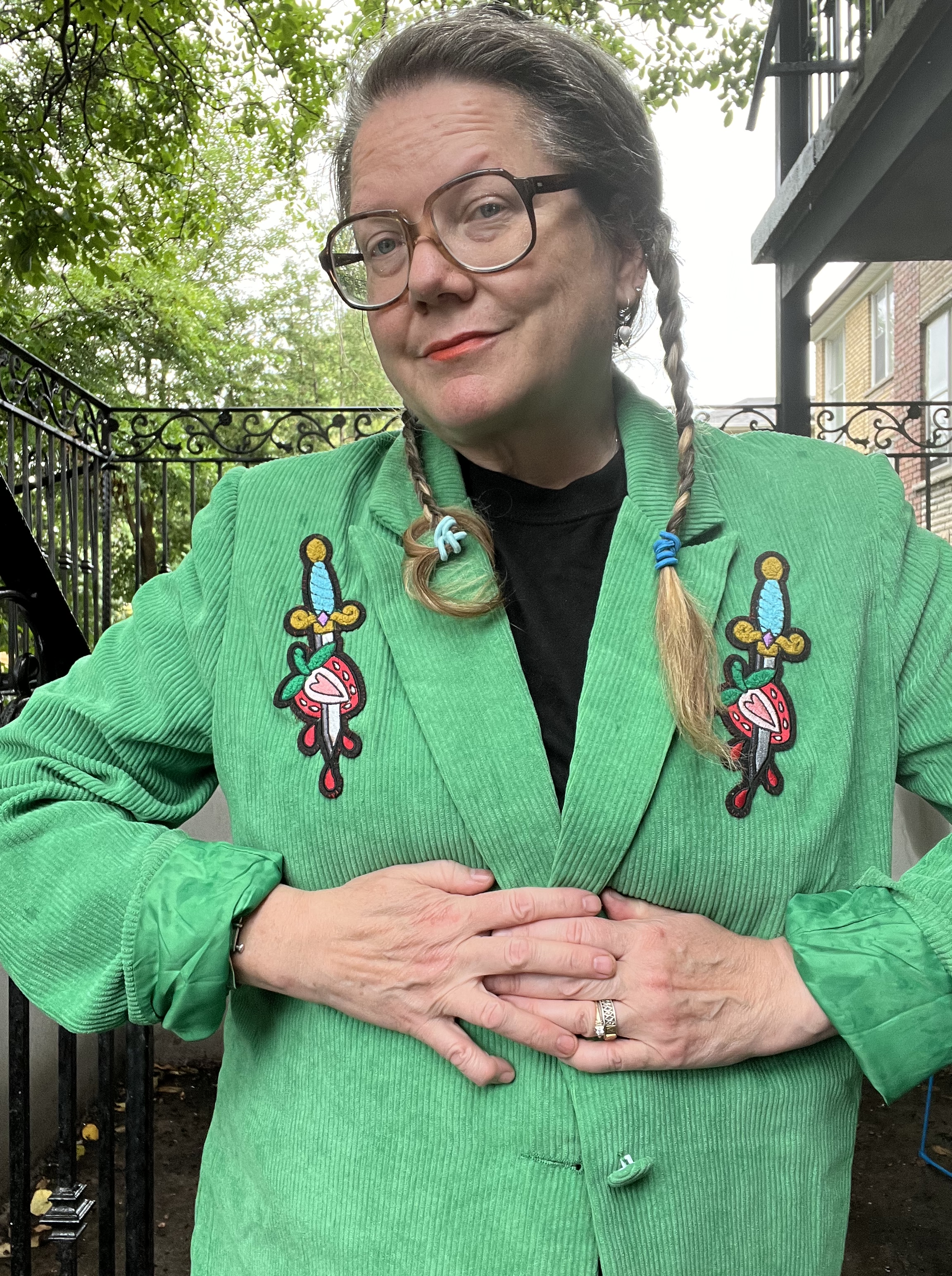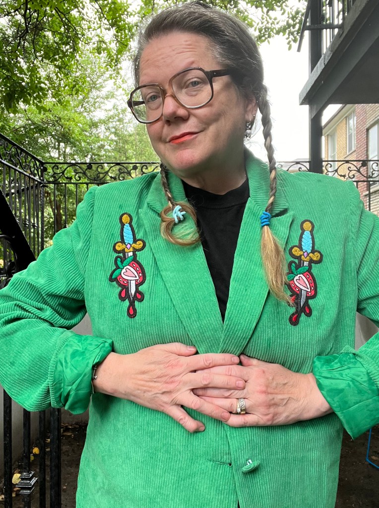 After a bit of a lull, I’m back on my crafting/upcycling BS again. In no particular order, I saw a YouTube video of designer Emily Rode’s apartment which lead me to revisit her clothes which triggered my algorithms to send me images of similar looks. Amongst these photos was a picture of a blazer covered in retro patches. This reminded me that I ordered chenille patches from Blu Hummingbird a ways back and I hadn’t figured out what to attach them to. Then I remembered the green corduroy blazer I thrifted last year. I could place these daggers like the embellishments on a Nudie Jacket. And so I stayed up late making it so.