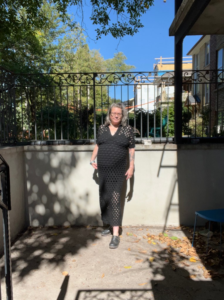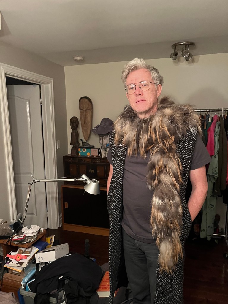 Our neighbour had a yard sale, you see. So I masked up and perused from a distance. I picked out three things: A wool herringbone sleeveless coat (it reminded me the Horses Atelier Alchemical jacket), a crocheted maxi dress (it reminded me a bit of Bode), and a fur boa.