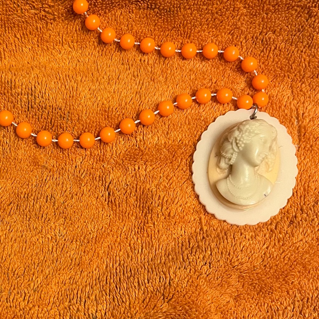 I also bought a three-pack of plastic beads because I needed something to hang my recently thrifted plastic cameo pendant on. Previously, I tried it out on a ribbon but it just didn’t feel right. I think this has the right combination of colour (the peach tones of the pendant soften the orange), and scale (the size of the beads balances the cameo and echoes the scalloping around the base).