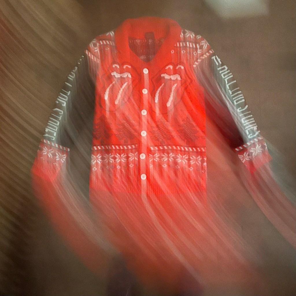I did have an hour in between blood tests today, so I killed time visiting the Giant Tiger in Etobicoke. My goal was to buy candy for the trick or treaters, but then I spotted this Rolling Stones themed ugly Christmas cardigan.