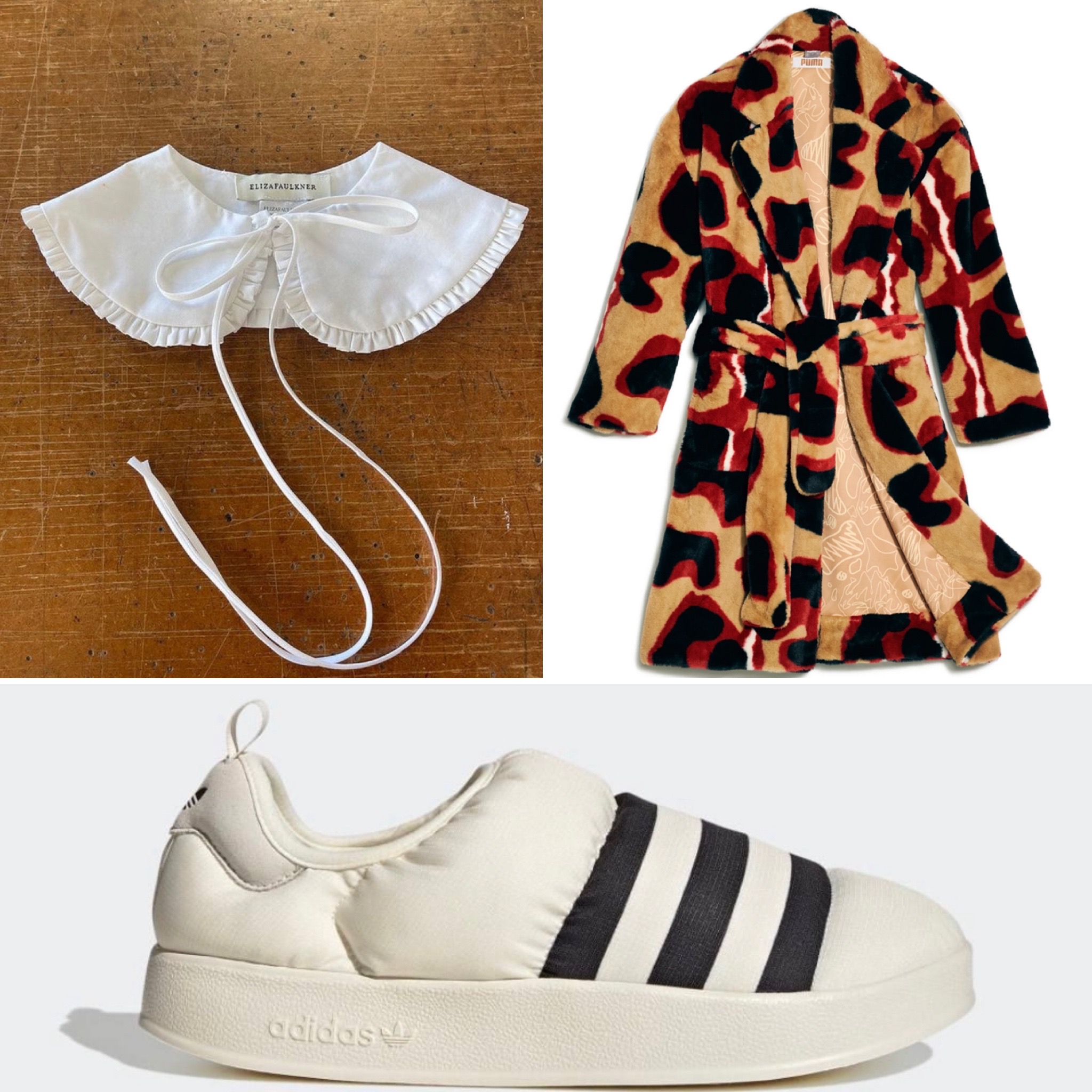 Some more fun garments. I consider these things to be quite understated: a detachable Eliza Faulkner collar; a Puma Basketball Coat; Adidas puffy Adilettes.