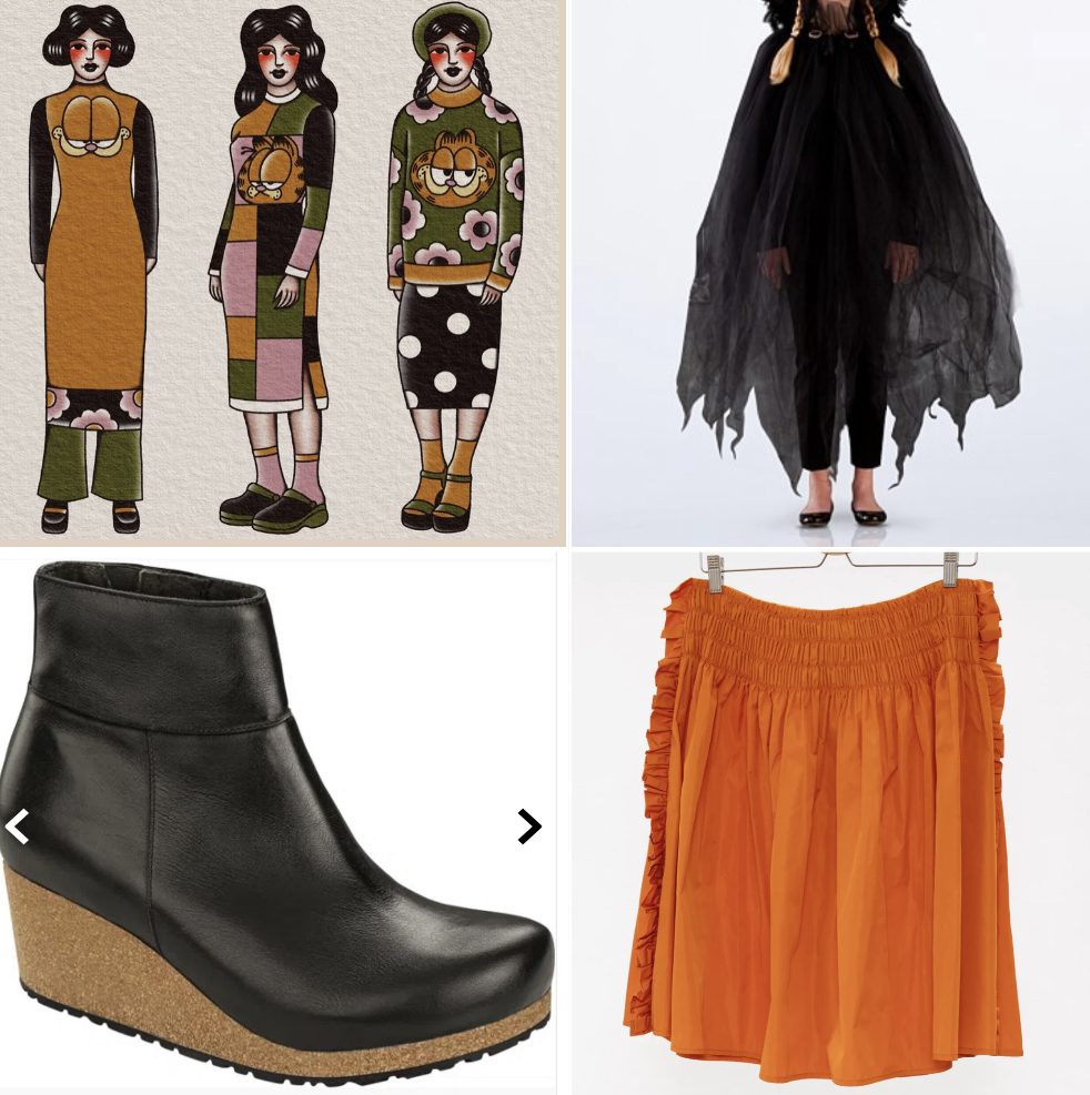 Let’s jump in. Pictured above (clockwise from top left): A Stacy Ann Tattoos flash sheet print (I would like a tattoo but the artist is based in Australia which is outside of my travel range); A Bed Bath and Beyond Witch Cape (it’s on sale, so if you are on a budget, it’s an easy thing to buy me); A Warren Everett Scott skirt; and a pair of Birkenstock boots.
