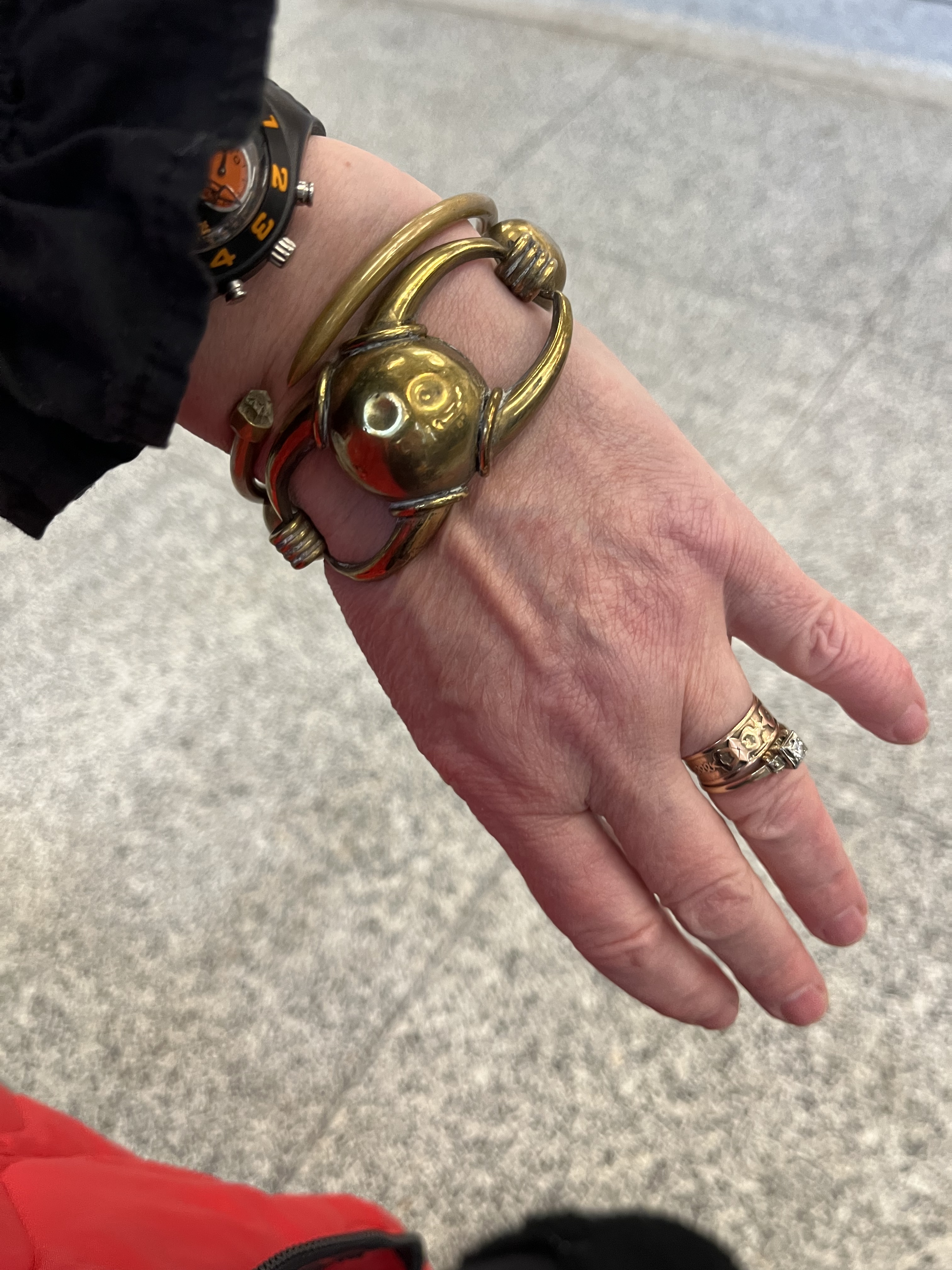 I also got this domed brass bracelet. It’s unmarked but the hardware and style screams 1940s made in Mexico to me. It’s also a bit battered but I love its clunkiness. It will look so good with a stack of wood bangles!