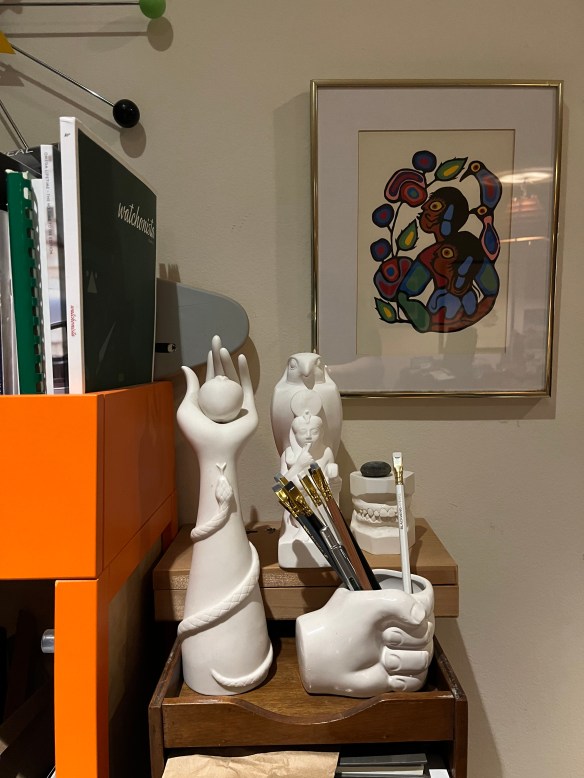 We already had a lot of sculpture and decorative art when we moved in. A lot of ceramics are still in storage. I had promised myself that I would rotate the collections but I haven’t. So tonight I decided to move some things around while incorporating the new pharaoh. Here are a couple of combinations. Not sure which direction I will go in quite yet. In