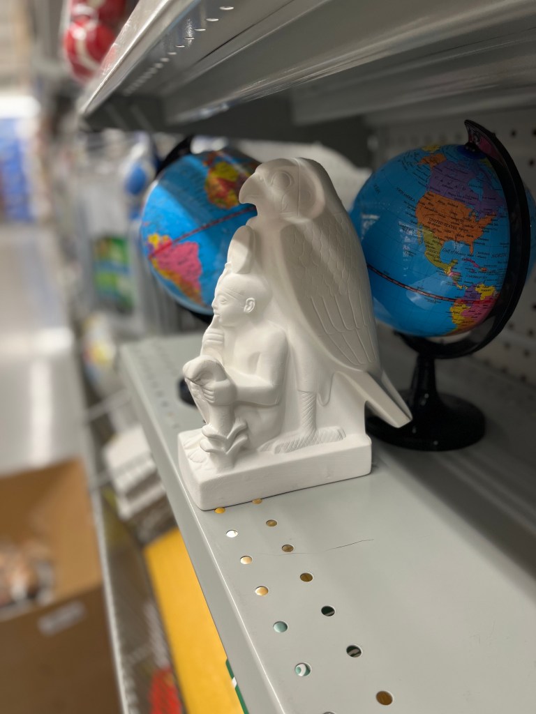 I found this plaster objet at the Dollarama today. I can’t imagine how the discount boutique ended up importing ancient Egyptian-style statue of Horus protecting a pharaoh so I figured I better grab one just in case it was a one-off (I still regret the day I left some Michael Graves Design for Target mixing bowls on the shelf only to return the next day to find them gone, never to return).