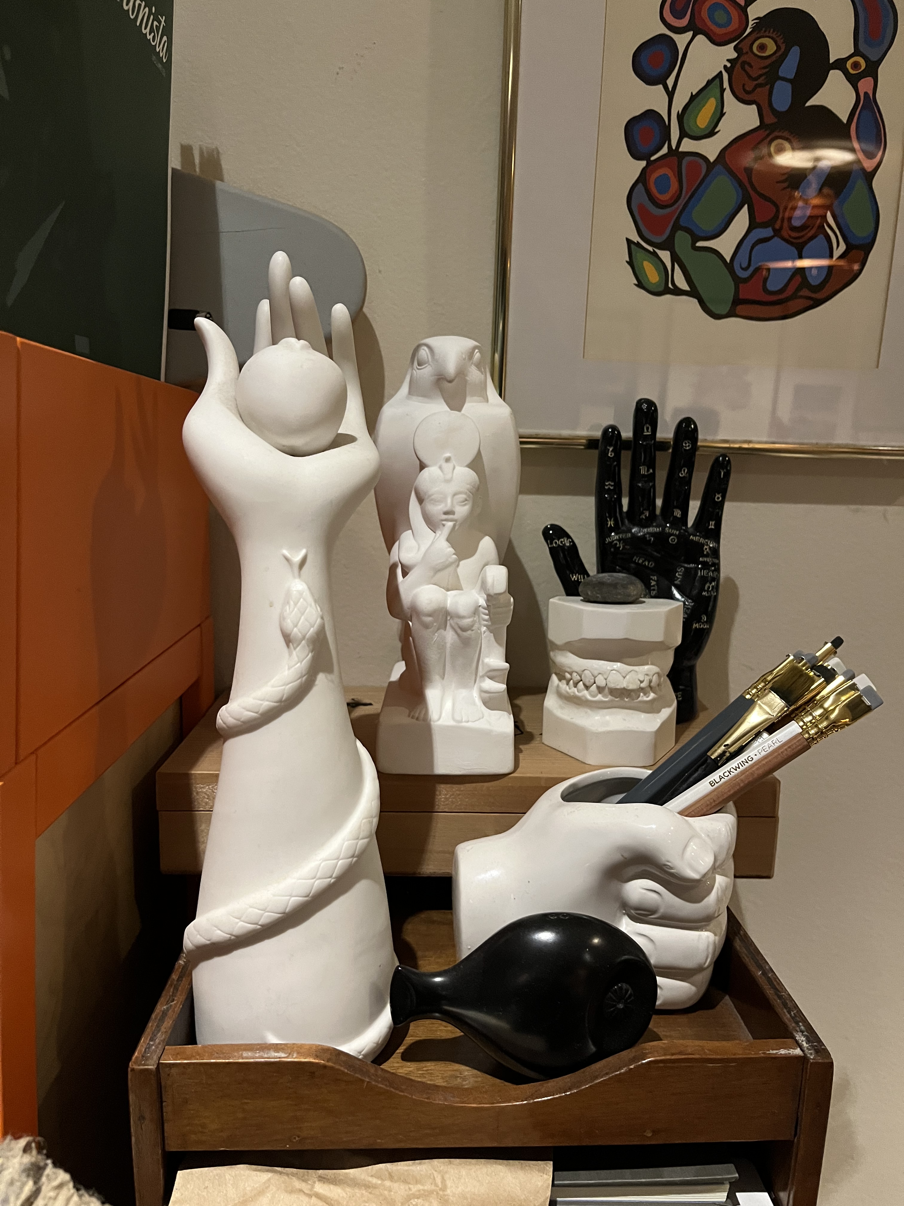 We already had a lot of sculpture and decorative art when we moved in. A lot of ceramics are still in storage. I had promised myself that I would rotate the collections but I haven’t. So tonight I decided to move some things around while incorporating the new pharaoh. Here are a couple of combinations. Not sure which direction I will go in quite yet. In